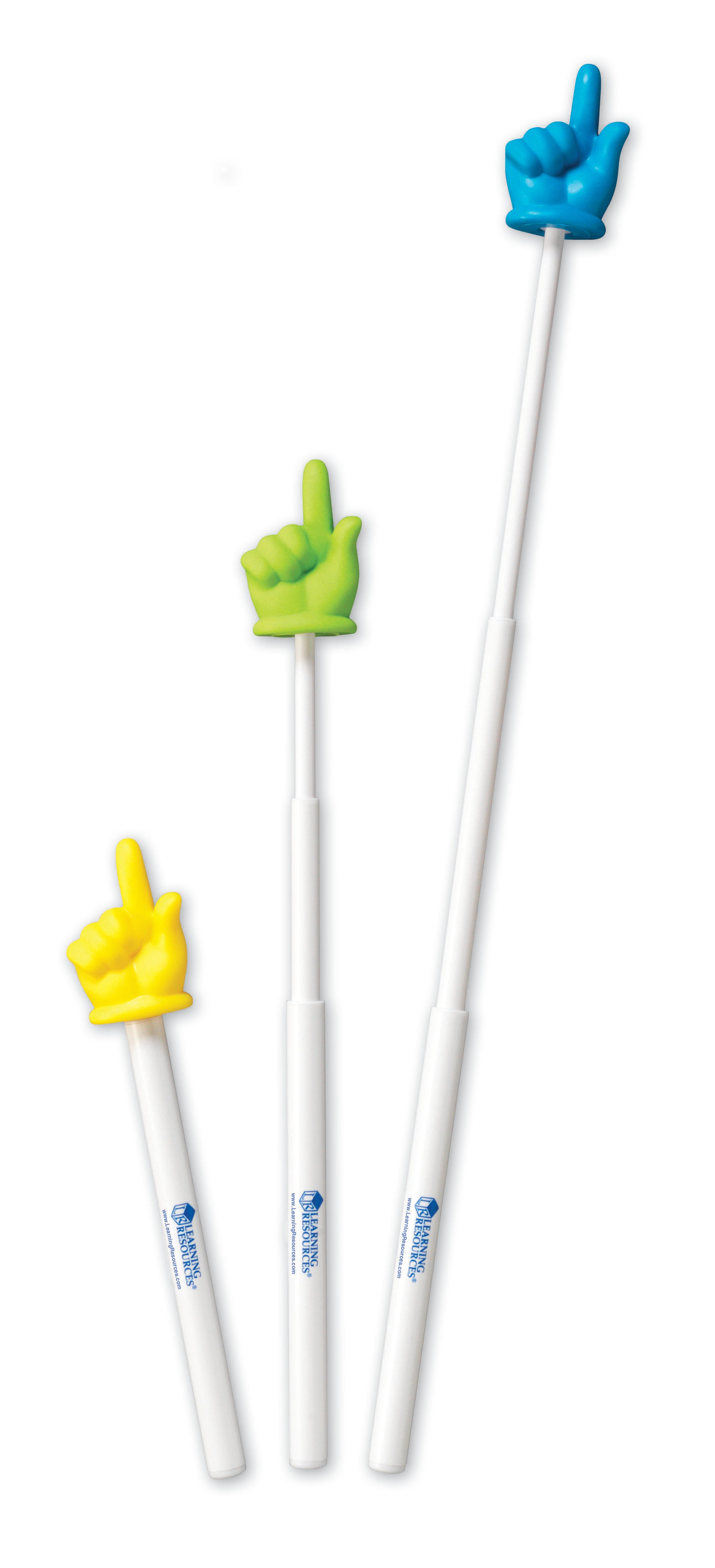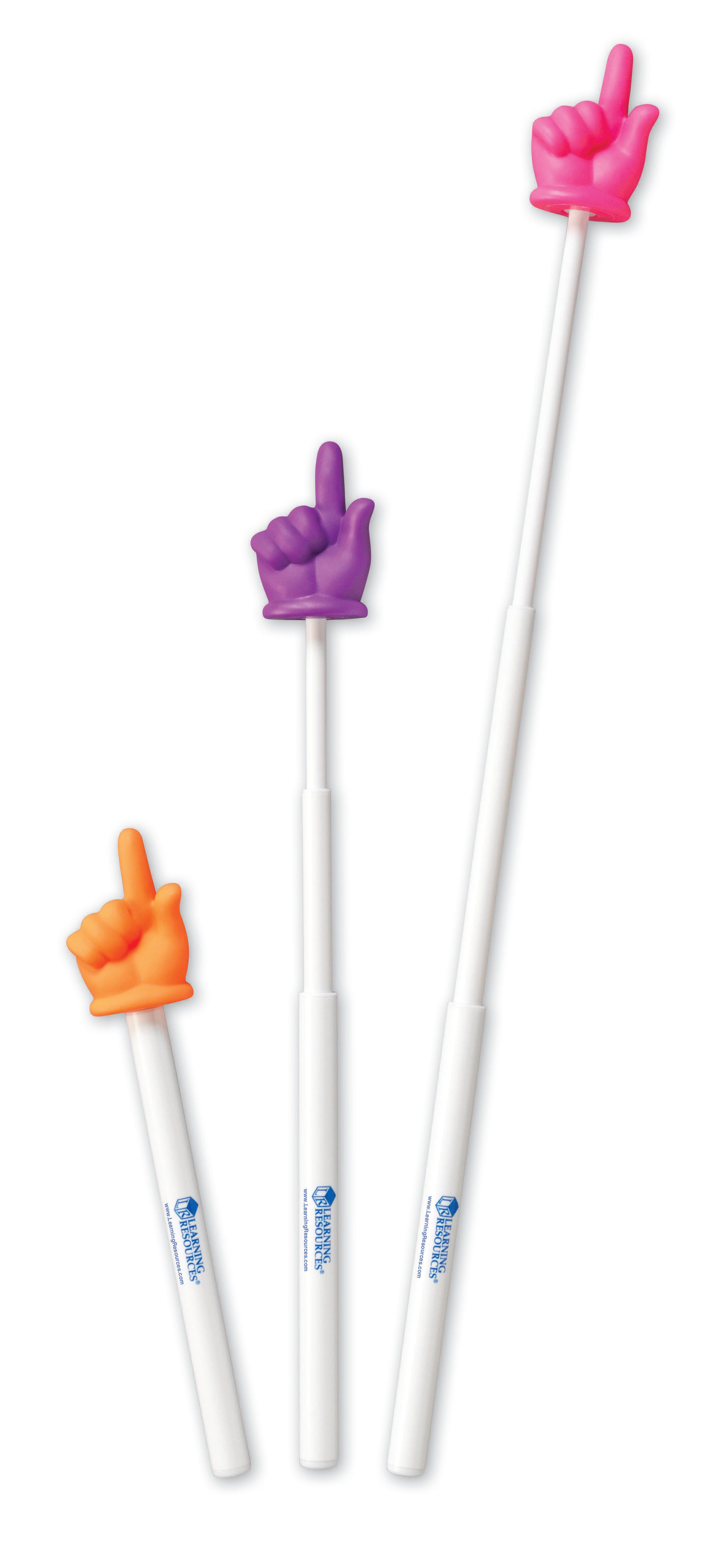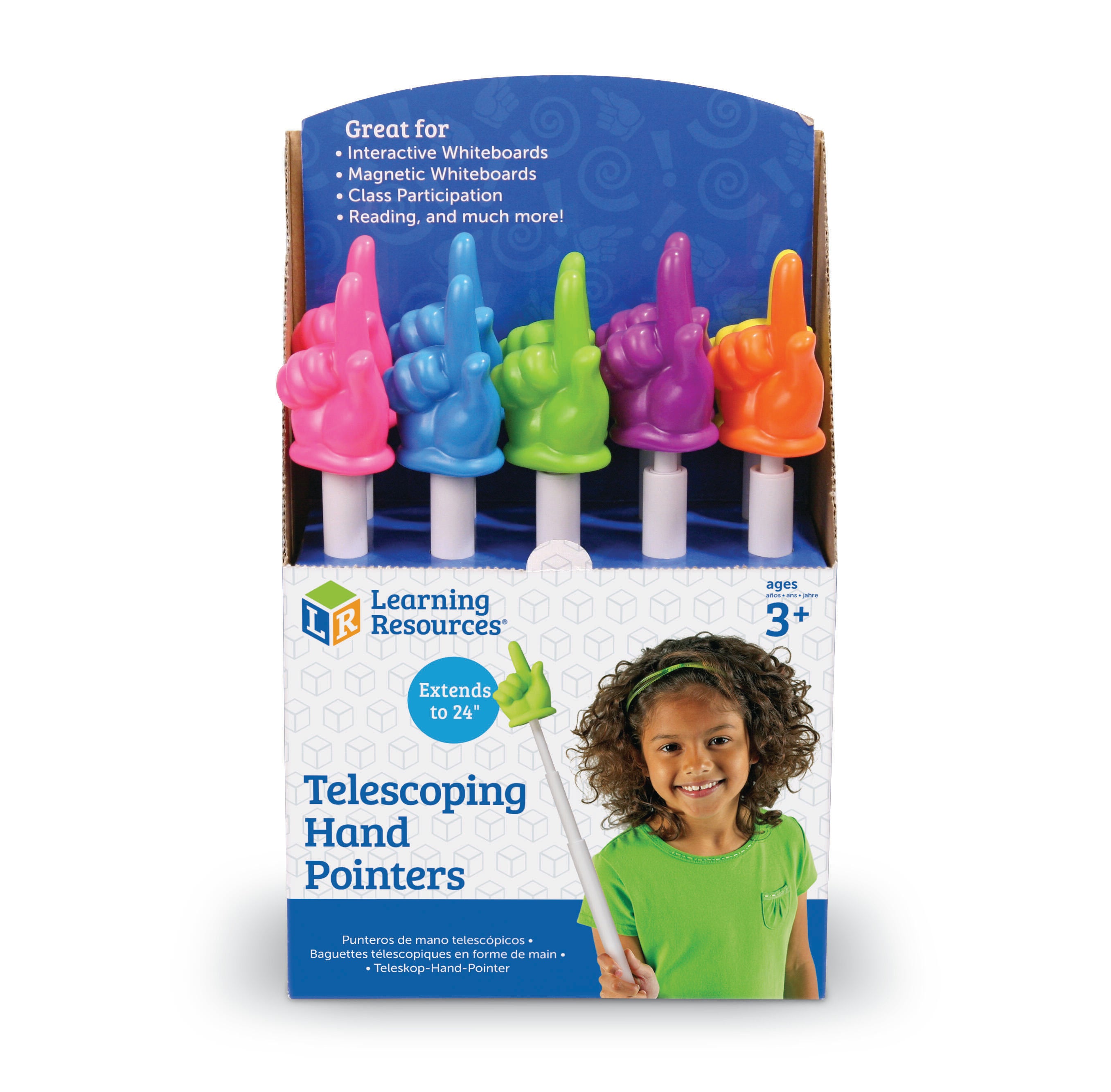 Learning Resources Telescoping Hand Pointers are whimsical pointers that generate positive behavioral support and make students eager to participate. Use with whiteboards, pocket charts, maps, and more. Colorful hands are easy to see against whiteboards! Extends from 10-1/2 L to 24 L inches. Ages 3 and up. Set of 10 assorted color pointers.