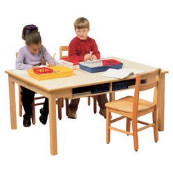 The Childcraft® Classroom Desk Table combines the features of a table with the functions of a desk. This large desk is great for classrooms, libraries, and play areas. Designed for early childhood settings, the durable table features a smooth laminate top for easy cleaning. It’s made of sturdy birch plywood panels and a solid maple apron and legs. The built-in storage shelf below the tabletop adds a functional element—perfect for books, folders, or art supplies. At just the right height for young learners, this wooden desk promotes independent work and collaborative play. Measures 47-3/4 W x 35-3/4 D x 28 H inches. Minor leg assembly required.Features