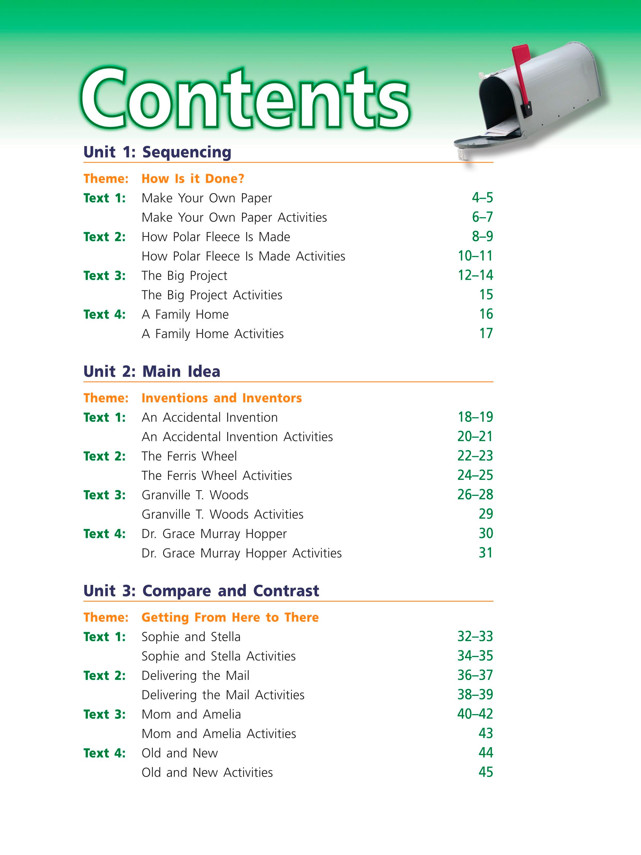 • Each unit focuses on one comprehension skill, such as comparing and contrasting, identifying main ideas, or differentiating between fact and option