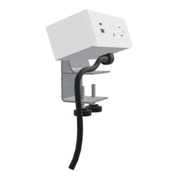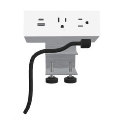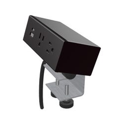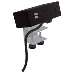 The clamp mount power accessory adds charging capability to any classroom. With two AC power outlets and two USB plug-ins, keep all your laptops, tablets, and other mobile devices fully charged. Adjusts to fit table tops up to 1-1/2 inch thick. Includes 10-foot power cord.