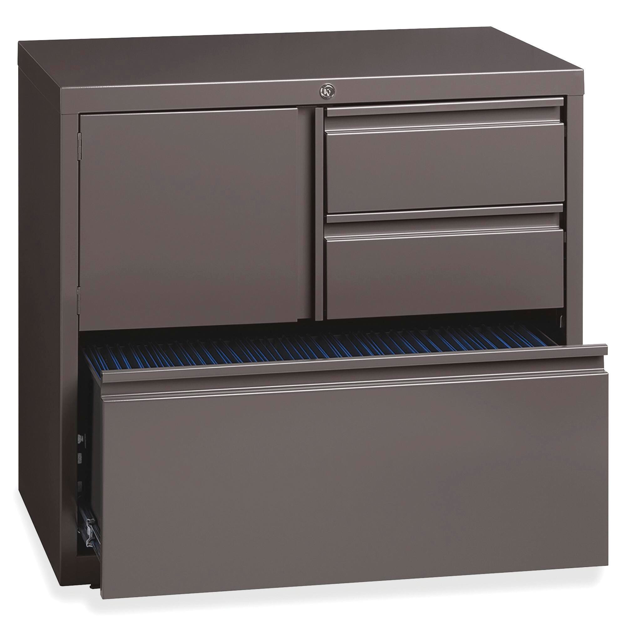 Lorell Personal Storage Center Lateral File offers versatile storage options with a personal storage compartment, two box-Drawers and a file-Drawer. File-Drawer includes hanging file rails for side-to-side filing in letter-size, legal-size or A4-size. Storage compartment includes a grommet for cable management. All three-Drawers and compartment lock with a core-removable lock with dual locking bars.-Drawers also feature full-width pulls and ball-bearing slide suspension. Use the included magnetic label holders for easy identification of-Drawer contents. Interlock system prohibits opening more than one-Drawer at a time. Counterweight prevents tipping. Steel construction has a baked enamel finish for durability. Lateral file also offers a reinforced base and four adjustable leveling glides to stabilize it on uneven surfaces. Lateral file meets or exceeds ANSI-BIFMA standards
