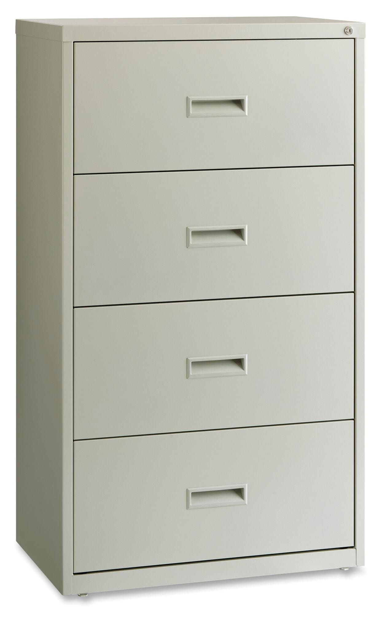 Lorell Commercial-Grade 30 inch Light Gray Lateral File offers side-to-side filing for letter-size, legal-size or A4-size folders with the included hanging file rails to meet your filing needs. Interlock system prohibits the extension of more than one-Drawer at a time. Counterweight prevents tipping. Versatile file-Drawers offer three-part, steel ball-bearing, slide suspension. Commercial-grade lateral file is equipped with a core-removable lock for security, monochromatic-Drawer pulls, and two adjustable leveling guides for stabilization. Steel construction contains recycled material. Lateral file meets and/or exceeds applicable ANSI/BIFMA standards.
