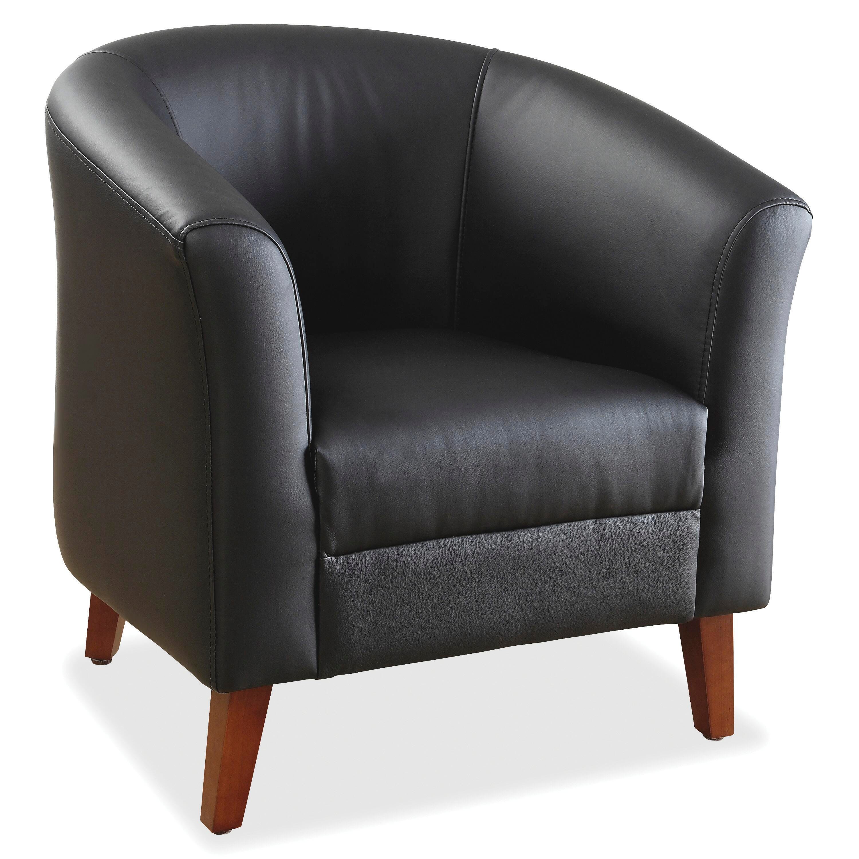 Add style and elegance to any reception or lounge area with this barrel armchair. It is upholstered with black bonded leather for a professional look. Classic design includes a supportive back, nearly full-height arms and a thickly cushioned seat. Four wooden legs hold up to 250 lb. capacity.