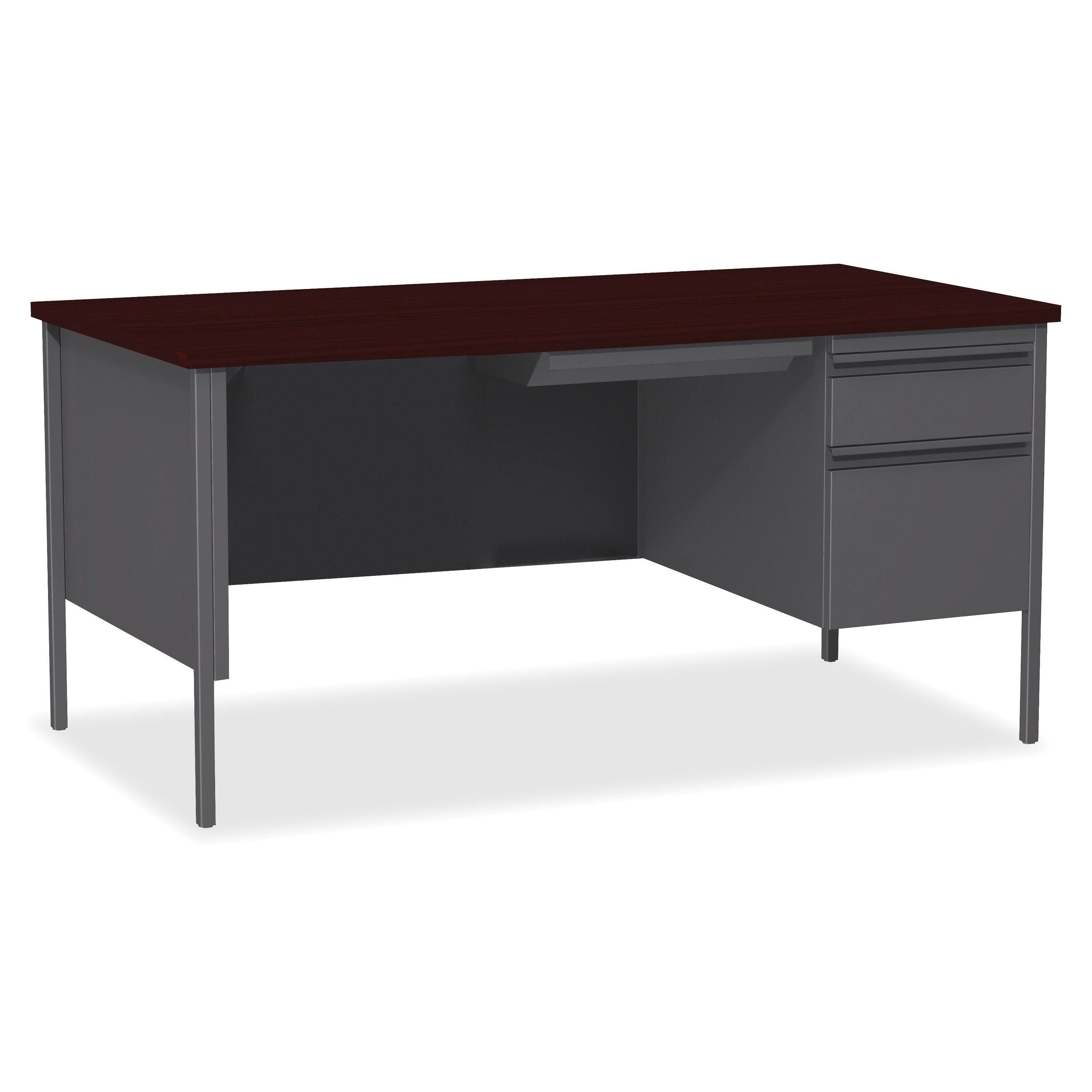 Lorell Mahogany Laminate Fortress Series Desk offers a practical and professional desk solution ideal for business, government and educational offices. Durable, high-performance steel construction withstands rigorous daily use. The 1-1/8 inch thick top with square edges features a Mahogany laminate surface that is scratch-resistant, stain-resistant and water-resistant. Desks are also equipped 3/4 modesty panels and 3/4 box/file pedestals with full-extension, ball-bearing slides and a locking center drawer. Integrated drawer pulls are full-width. Central-locking center drawer on desks include a core-removable lock. Reinforced, double-frame inner structure keeps desk solid and sturdy for years of use. Steel Desk meets or exceeds ANSI/BIFMA standards. Each unit is sold separately.