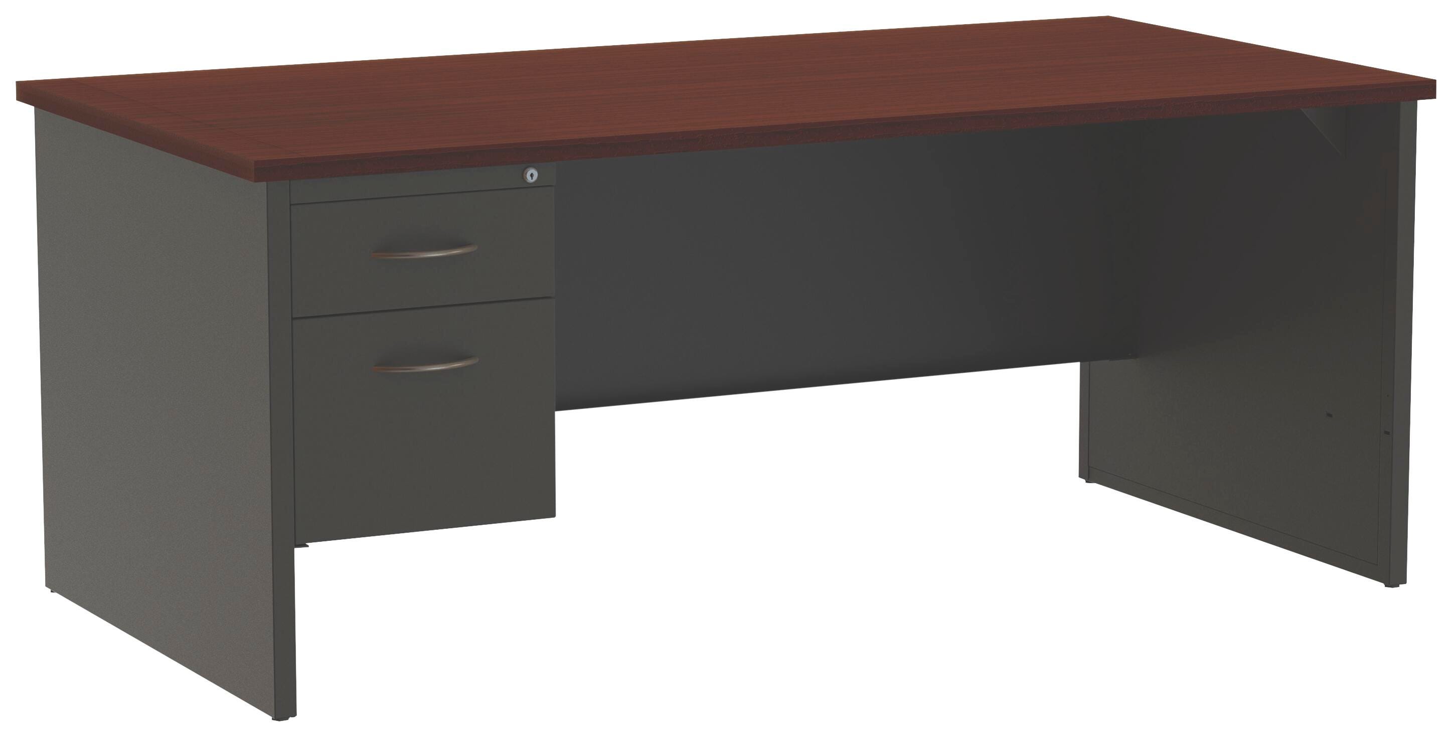 This modular desk series features commercial-quality performance and components. The durable steel chassis supports a 1-1/8" thick laminated top with integrated grommets for wire management. Laminate is stain-resistant and scratch-resistant for durability. To create a U-workstation, simply combine a desk with a bridge and credenza. Desk includes one box drawer for supplies and one file drawer for documents. File drawers with premium arch-pull handles accept hanging file folders for paper management. Steel ball-bearing suspension makes drawers easy to operate quietly. Built-in cord management provides easy access to power and data while minimizing clutter. The rich mahogany laminate and charcoal paint create an upscale look and feel for any application. Superior steel construction withstands heavy activity and relocation.