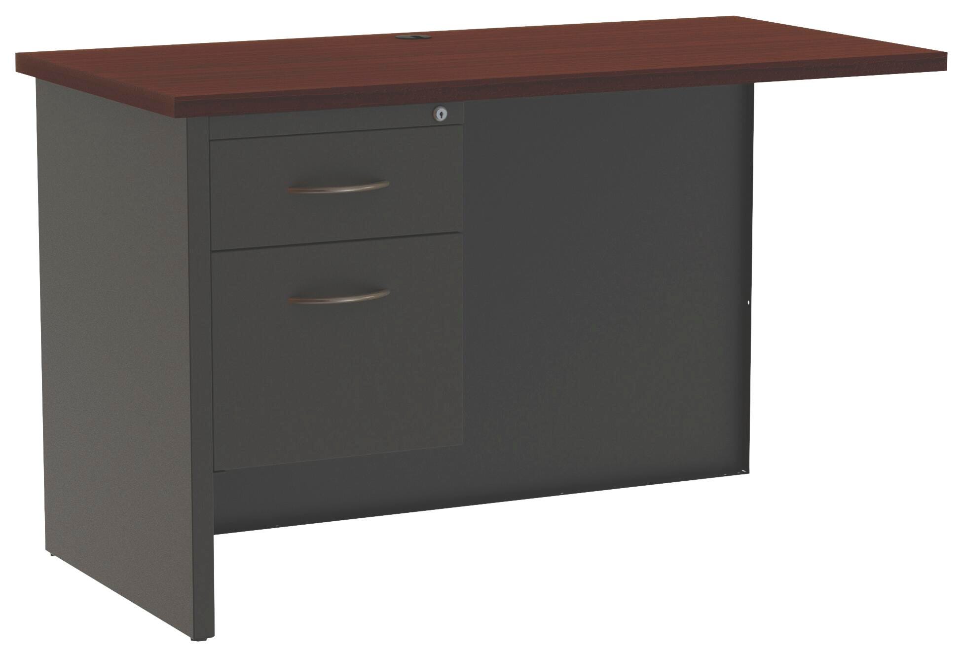 This modular desk series features commercial-quality performance and components. The durable steel chassis supports a 1-1/8" thick laminated top with integrated grommets for wire management. Laminate is stain-resistant and scratch-resistant for durability. To create a U-workstation, simply combine a desk with a bridge and credenza. Desk includes one box drawer for supplies and one file drawer for documents. File drawers with premium arch-pull handles accept hanging file folders for paper management. Steel ball-bearing suspension makes drawers easy to operate quietly. Built-in cord management provides easy access to power and data while minimizing clutter. The rich mahogany laminate and charcoal paint create an upscale look and feel for any application. Superior steel construction withstands heavy activity and relocation.
