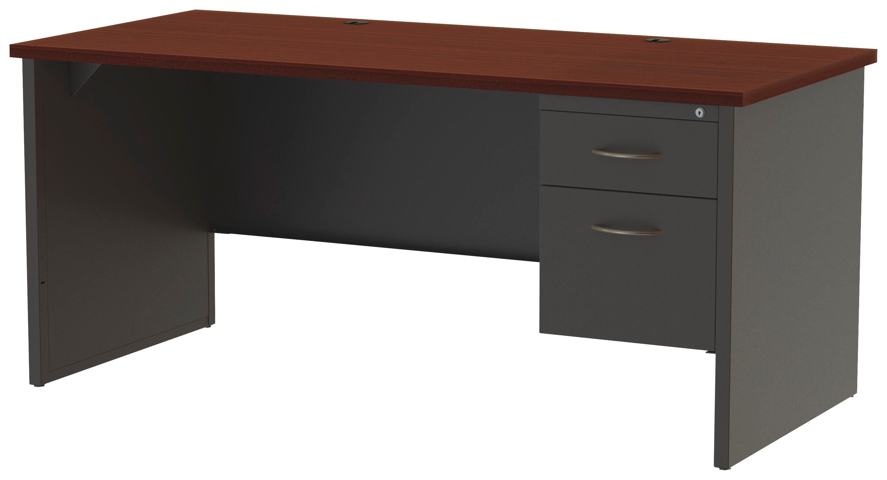 This modular desk series features commercial-quality performance and components. The durable steel chassis supports a 1-1/8" thick laminated top with integrated grommets for wire management. Laminate is stain-resistant and scratch-resistant for durability. To create a U-workstation, simply combine a desk with a bridge and credenza. Desk includes one box drawer for supplies and one file drawer for documents. File drawers with premium arch-pull handles accept hanging file folders for paper management. Steel ball-bearing suspension makes drawers easy to operate quietly. Built-in cord management provides easy access to power and data while minimizing clutter. The rich mahogany laminate and charcoal paint create an upscale look and feel for any application. Superior steel construction withstands heavy activity and relocation.