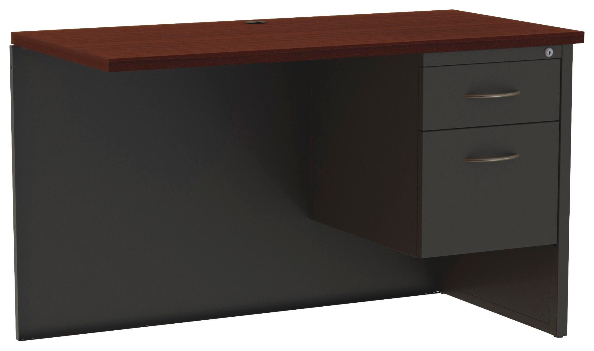 This modular desk series features commercial-quality performance and components. The durable steel chassis supports a 1-1/8" thick laminated top with integrated grommets for wire management. Laminate is stain-resistant and scratch-resistant for durability. To create a U-workstation, simply combine a desk with a bridge and credenza. Desk includes one box drawer for supplies and one file drawer for documents. File drawers with premium arch-pull handles accept hanging file folders for paper management. Steel ball-bearing suspension makes drawers easy to operate quietly. Built-in cord management provides easy access to power and data while minimizing clutter. The rich mahogany laminate and charcoal paint create an upscale look and feel for any application. Superior steel construction withstands heavy activity and relocation.