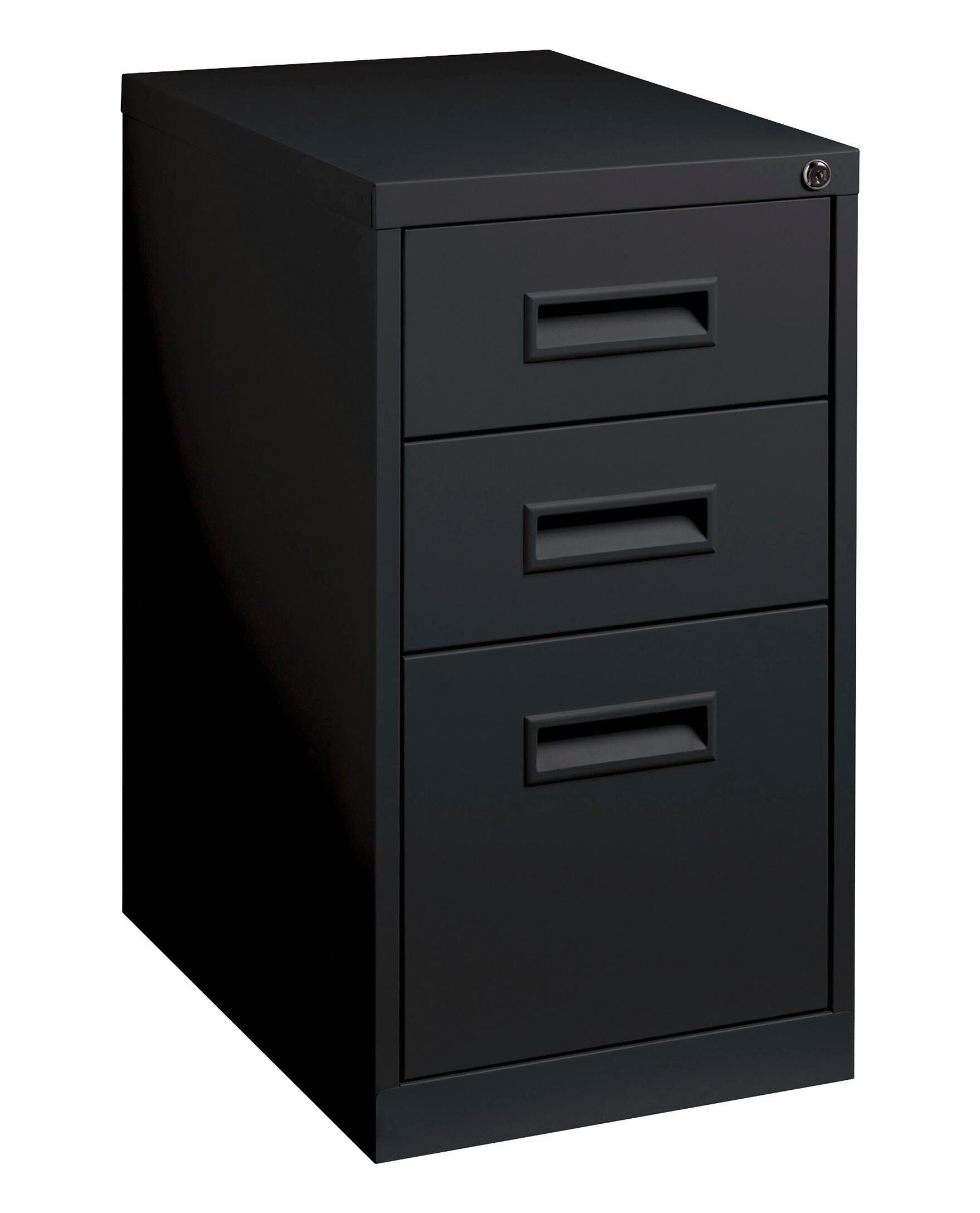 Lorell Box/Box/File Recessed Pull Mobile Pedestal Files with factory-installed, core-removable lock secures all drawers. It provides an ample space for all your filing and supplies. Pedestal made of high quality steel offers a perfect depth to slide easily into your cubicle or other office configuration. File drawer is great to accommodate letter-size hanging folders with tabs securely. It incorporates steel ball bearing, drawer suspension that deliver smooth drawer access to file drawer. Drawer fronts have color-matched, recessed handles that renders additional comfort and style. Pedestal with hidden casters from view aids to move the pedestal easily when necessary. 15 W x 22 D x 27-3/4 H inches. Black. Mobile pedestal file meets or exceeds applicable ANSI/BIFMA standards.Features