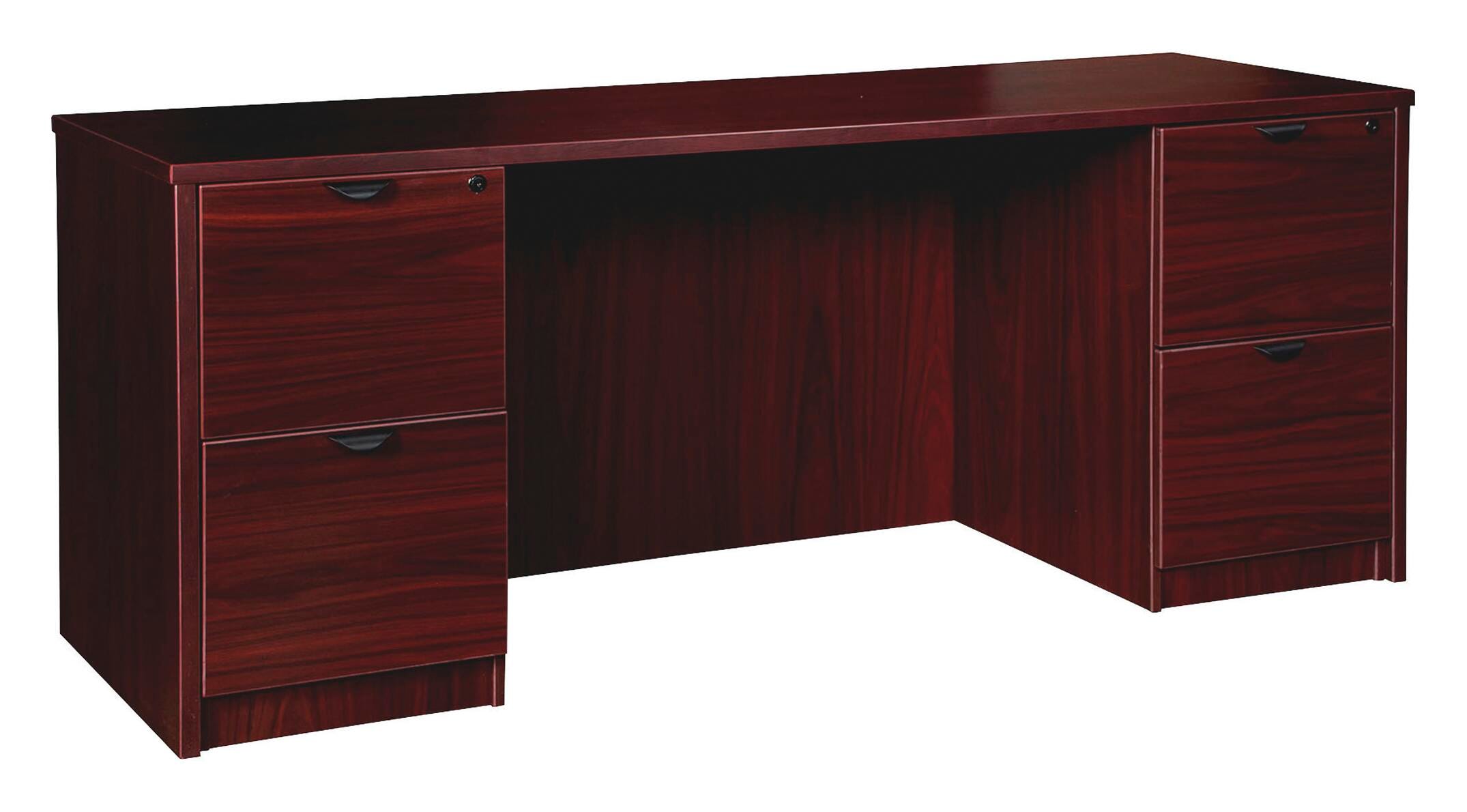 Double-pedestal credenza features a durable, mahogany laminate surface that is mar-resistant, burn-resistant and impact-resistant to withstand hectic, daily work life. The 1-inch thick top features matching 3mm edgebanding. All surfaces are manufactured with 45-pound density particleboard and finished on both sides with high-performance, thermally fused melamine. Freestanding, 66-inch wide credenza features a full modesty panel for privacy and two full pedestals each with two locking file drawers to secure your important documents in letter-size and legal-size hanging files. Hangrails are included. File drawers have 100 pounds full-suspension, ball-bearing slides. Use the single grommet in the top and back to easily route your cords. The 3/4-inch adjustable glides allow credenza to remain level on uneven surfaces. Ships fully assembled.Includes: