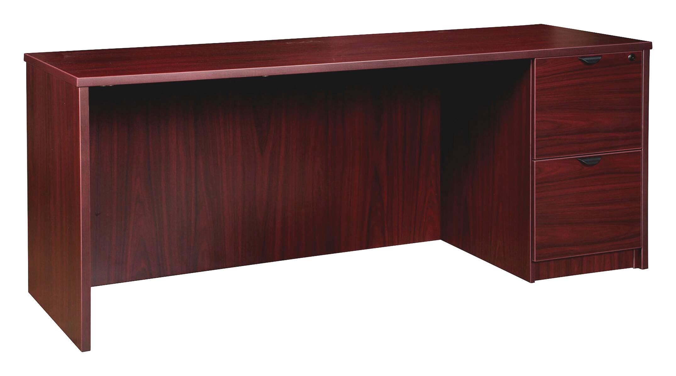 Right-pedestal credenza pairs perfectly with single-pedestal desks, returns and bridges to create L-shaped and U-shaped configurations. Durable, mahogany laminate surface is mar-resistant, burn-resistant and impact-resistant to withstand hectic, daily work life. The 1-inch thick top with matching 3mm edgebanding is made with 45-pound density particleboard and finished on both sides with high-performance, thermally fused melamine. Freestanding, 66-inch wide credenza features a full modesty panel for privacy, single grommet in the top and back, and one full pedestal with two locking file drawers to secure your important documents in letter-size and legal-size hanging files with included hangrails. File drawers have 100 pounds full-suspension, ball-bearing slides. The 3/4-inch adjustable glides allow credenza to remain level on uneven surfaces. Ships fully assembled.Includes: