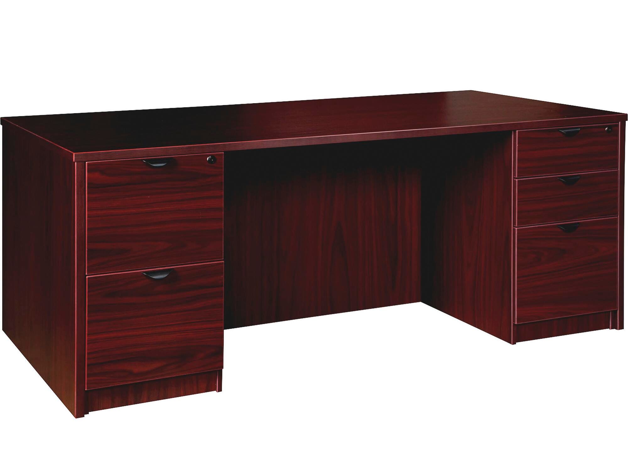 Double-pedestal desk features a durable, mahogany laminate surface is mar-resistant, burn-resistant and impact-resistant to withstand daily work life. The 1-inch thick top with matching 3mm edgebanding is made with 45-pound density particleboard and finished on both sides with high-performance, thermally fused melamine. The 72-inch wide desk features a full modesty panel for privacy, two grommets in the top, and two pedestals with locking drawers to secure files and supplies. One pedestal includes two file drawers while the other pedestal includes two box drawers for supplies and one more file drawer for additional file space. File drawers hold letter-size or legal-size hanging files with included hangrails. Box and file drawers have 100 pounds full-suspension, ball-bearing slides. The 3/4-inch adjustable glides allow desk to remain level on uneven surfaces. Ships fully assembled.Includes: