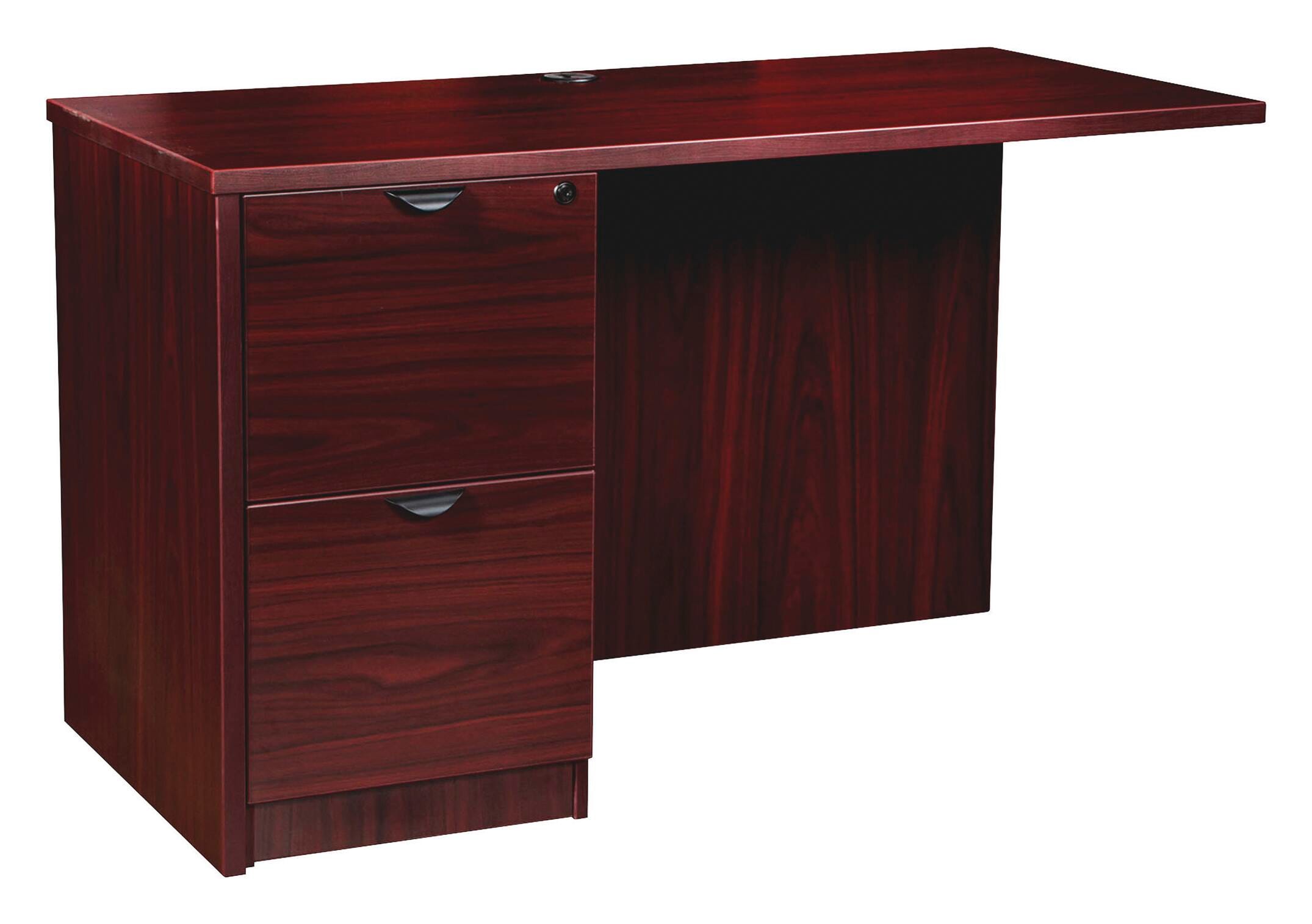 Left return desk pairs perfectly with right-pedestal desks or credenzas to create L-shaped and U-shaped configurations. Durable, mahogany laminate surface is mar-resistant, burn-resistant and impact-resistant to withstand hectic, daily work life. The 1-inch thick top with matching 3mm edgebanding is made with 45-pound density particleboard and finished on both sides with high-performance, thermally fused melamine. Return features a full modesty panel and a full pedestal with two locking file drawers to secure important files. File drawers hold letter-size or legal-size hanging files with included hangrails and have 100 pounds full-suspension, ball-bearing slides. The 3/4-inch adjustable glides allow return to remain level on uneven surfaces. Grommet in the top worksurface allows convenient cord management. Ships fully assembled.Includes: