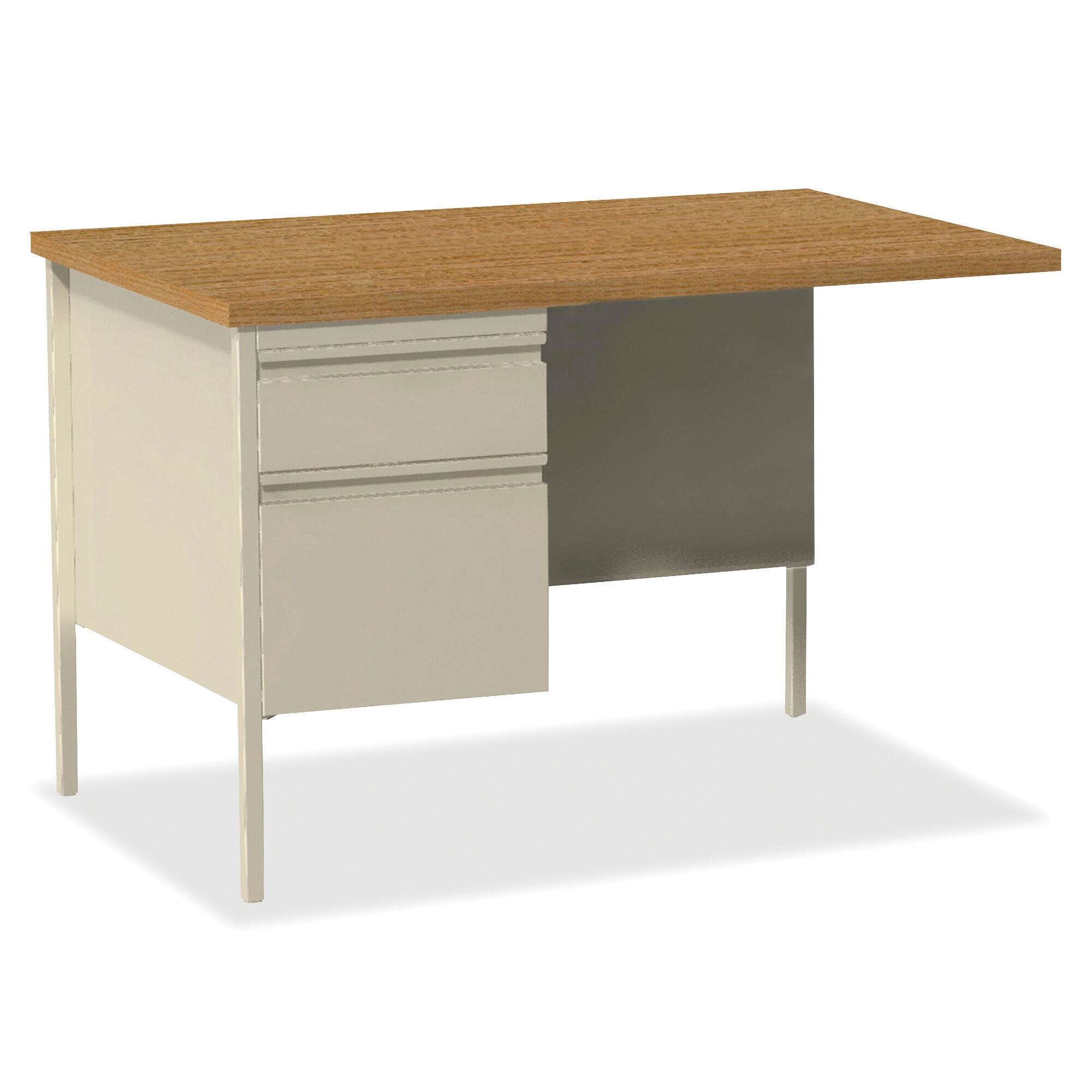 Lorell Putty Oak laminate Fortress Series Desk offers a practical and professional desk solution ideal for business, government and educational offices. Durable, high-performance steel construction withstands rigorous daily use. The 1-1/8 inch thick top with square edges features an Oak laminate surface that is scratch-resistant, stain-resistant and water-resistant. Desks are also equipped 3/4 modesty panels and box/file pedestals with full-extension, ball-bearing slides and a locking center drawer. Integrated drawer pulls are full-width. Central-locking center drawer on desks include a core-removable lock. Reinforced, double-frame inner structure keeps desk solid and sturdy for years of use. Steel Desk meets or exceeds ANSI/BIFMA standards. Each unit is sold separately.