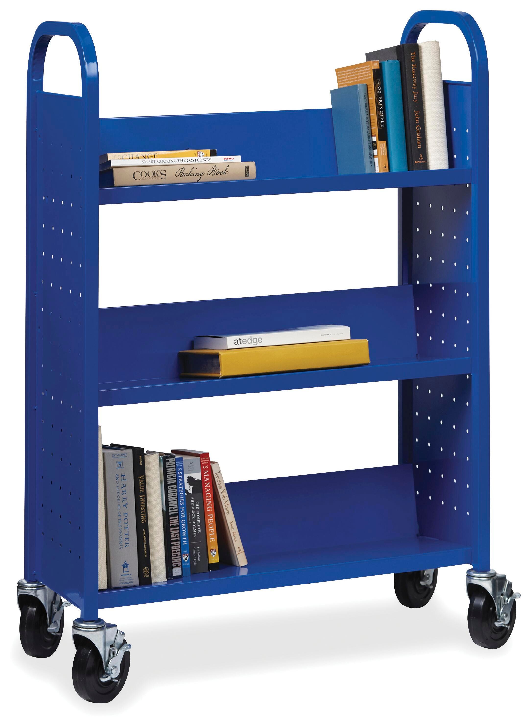 Single-sided book cart offers three slanted shelves where you can organize and transport your books and other items. The opening between each shelf measures 12 inches. Sturdy design features smooth rounded handles for easy maneuverability and perforated end panels for style and better air circulation.Includes:
