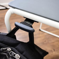 - Integrated modesty panel and dual retractable bag hooks for a complete desk system that lends both privacy and storage