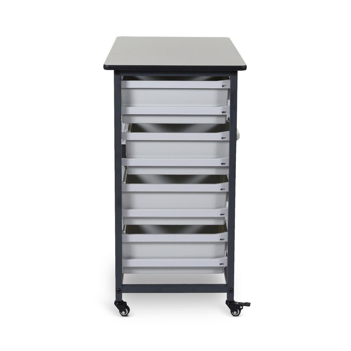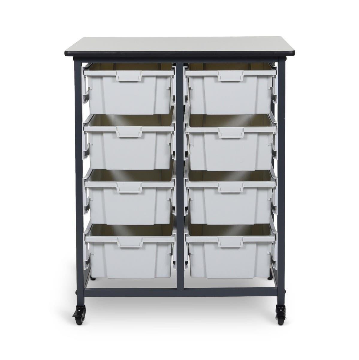 Conveniently store and systematize your daily essentials with this Mobile Bin System, made with a workbench top to create the perfect organization for makers spaces, art rooms, shops, and more. This storage unit is a double row unit, with 4 bins per row, 8 total bins. Each bin is 6 inches deep, designed with a wide handle that's easy to pull and designed to accommodate standard labels. Four casters allow smooth maneuverability; two locking brakes give stability for stationary use. Bins hold up to 20 pounds each. Measures 30-3/4 W x 20 D x 37-1/2 H inches. Bins measure 12-1/4 W x 16-3/4 D x 6 H inches.