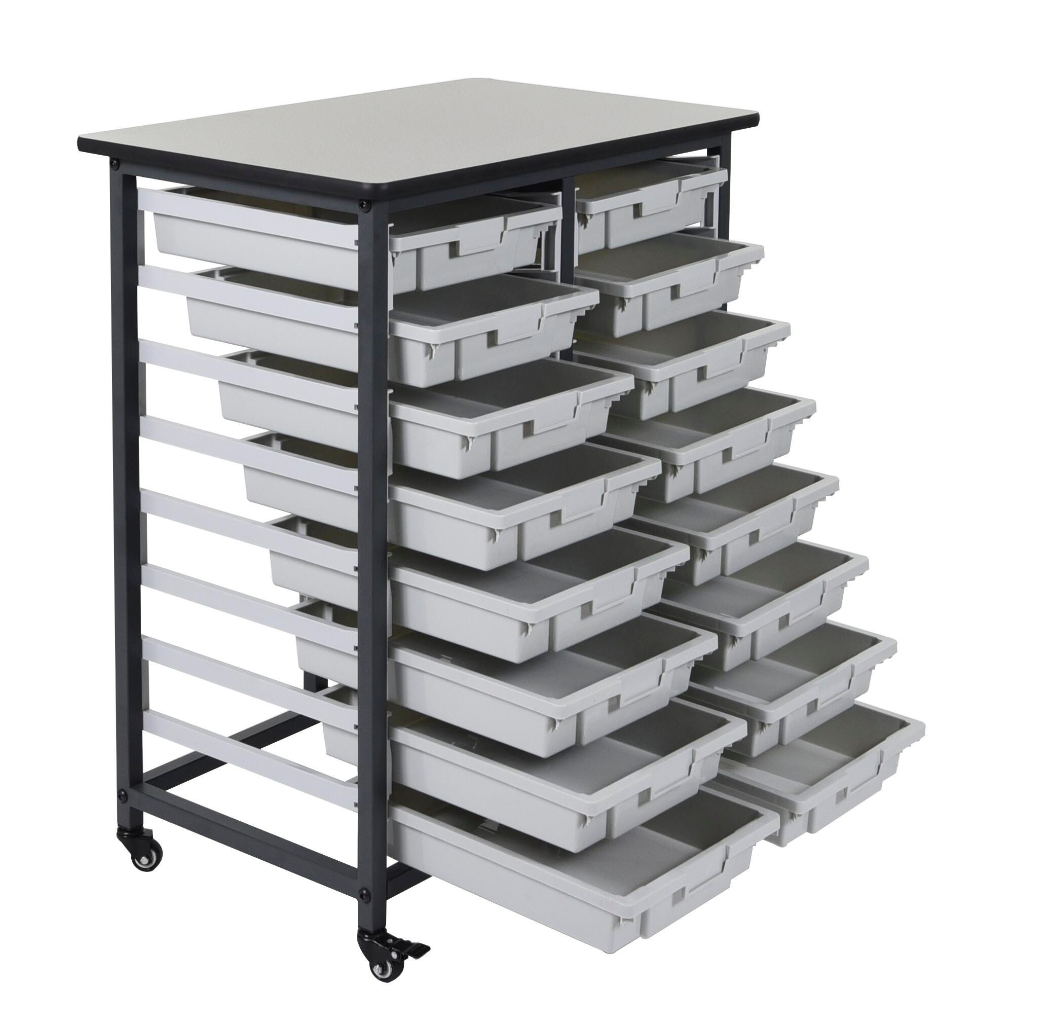 This storage unit is a double-row unit, with 8 bins per row (16 total bins). Each bin is 3 inches deep, and designed with a wide handle that fits standard labels for seamless organization. The flat top provides a work area or additional storage. Four casters allow smooth maneuverability; two locking brakes give stability for stationary use. Each bin holds up to 20 pounds, and measures 3 inches deep. Measures 30-3/4 W x 20 D x 37-1/2 H inches. Some assembly required.Features