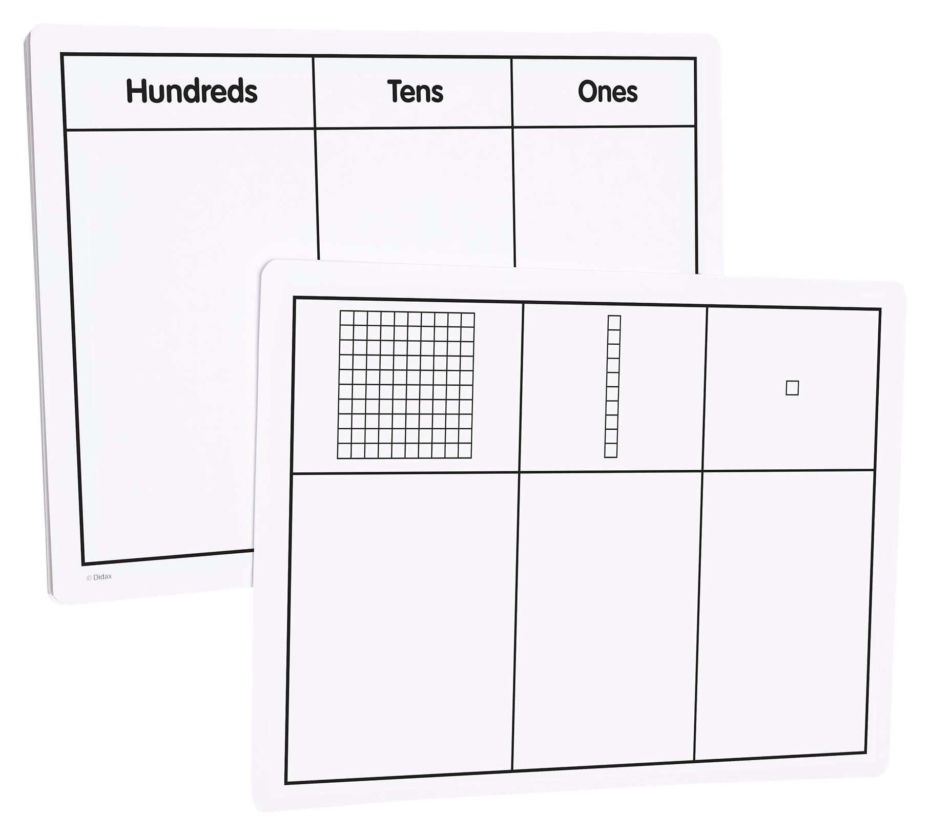 Mats have base ten blocks (hundreds, tens, ones) pictured on one side. On the reverse is a grid with labels "hundreds," "tens" and "ones". Each side has space for students to write in numbers. Mats measure 9 x 12 inches each and are made of tough, flexible plastic for use with dry-erase markers. Ideal for grades 1 to 6.Features