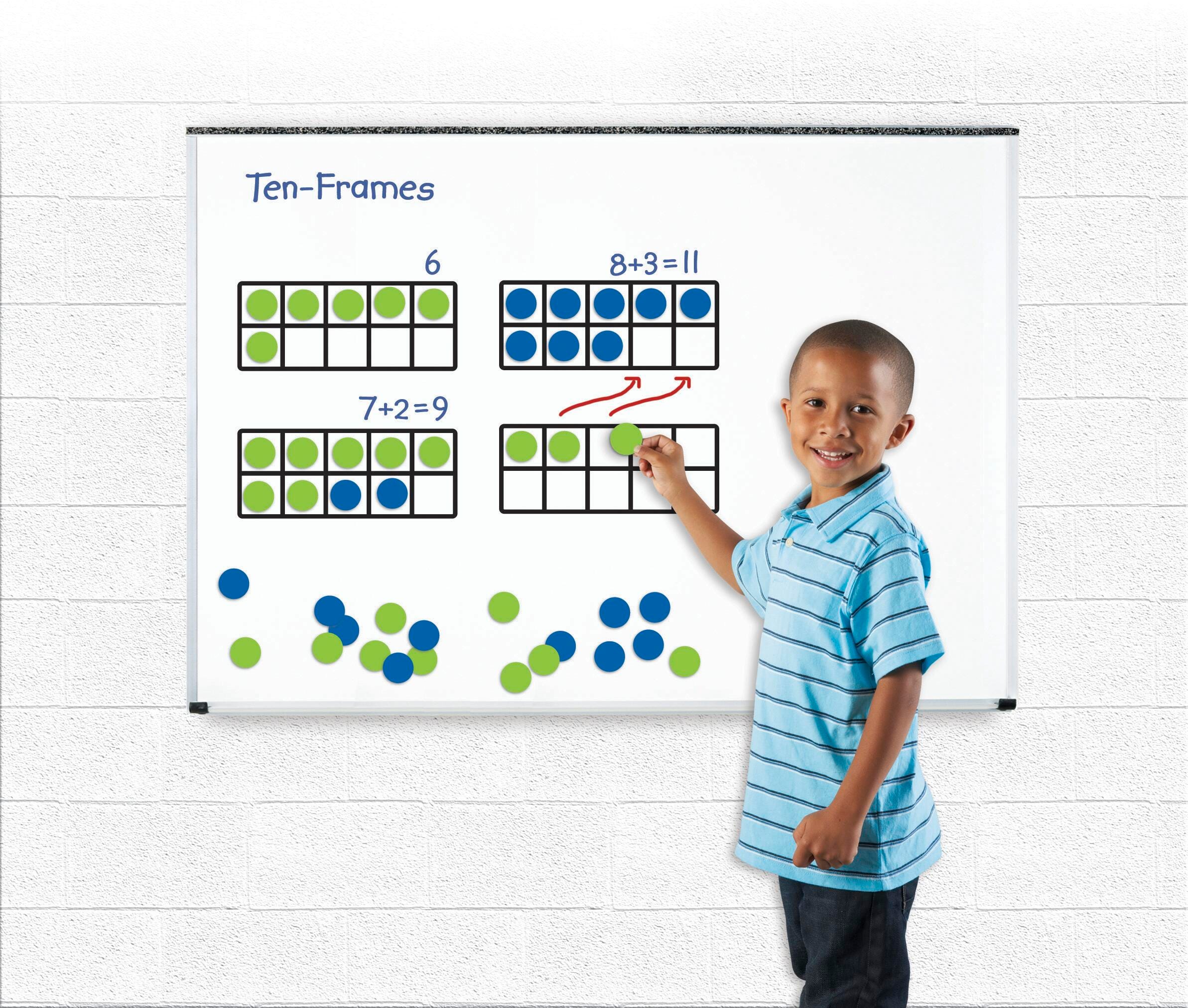 Giant magnetic ten-frames and colorful discs allow students and teachers to explore number and operations, base ten skills, and more. Includes 4 magnetic frames, 40 discs (20 green, 20 blue), and instructional guide. Frames measure 12-1/4 x 5 inches. Ages 5 and above.
