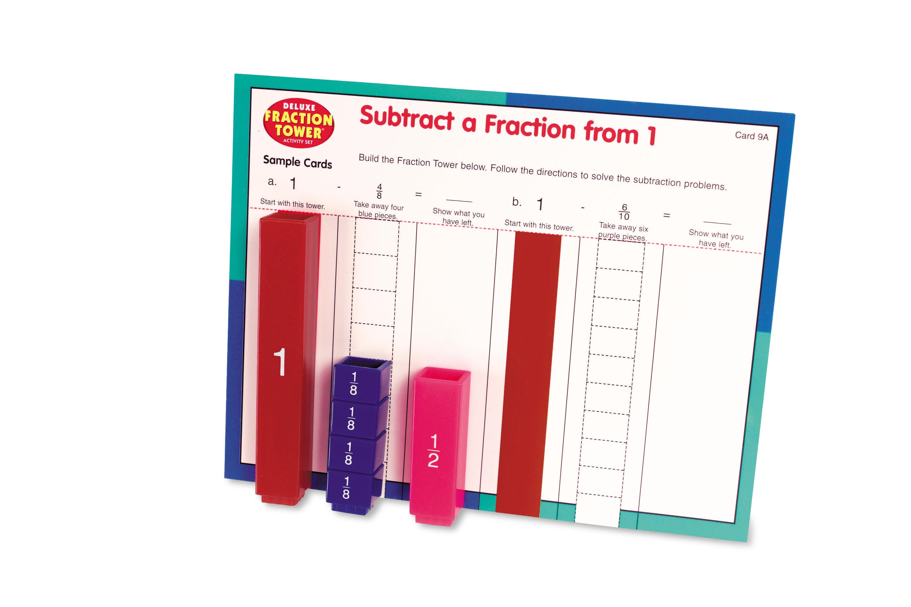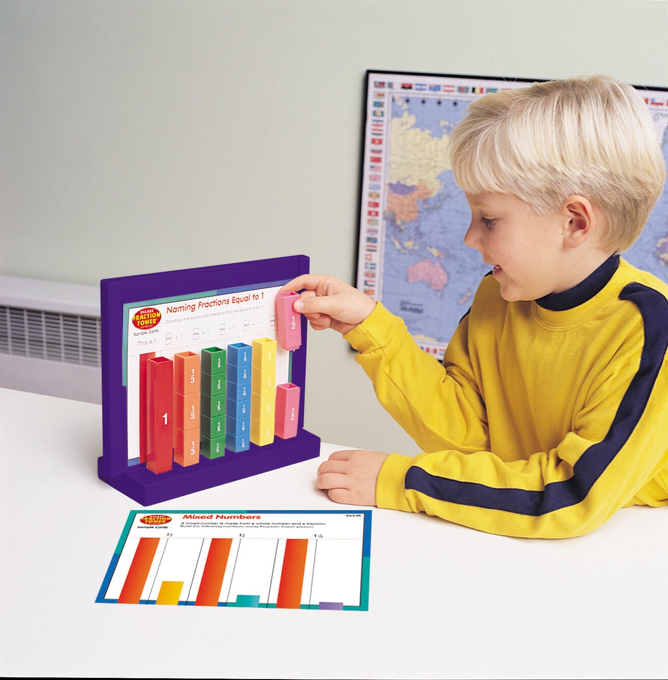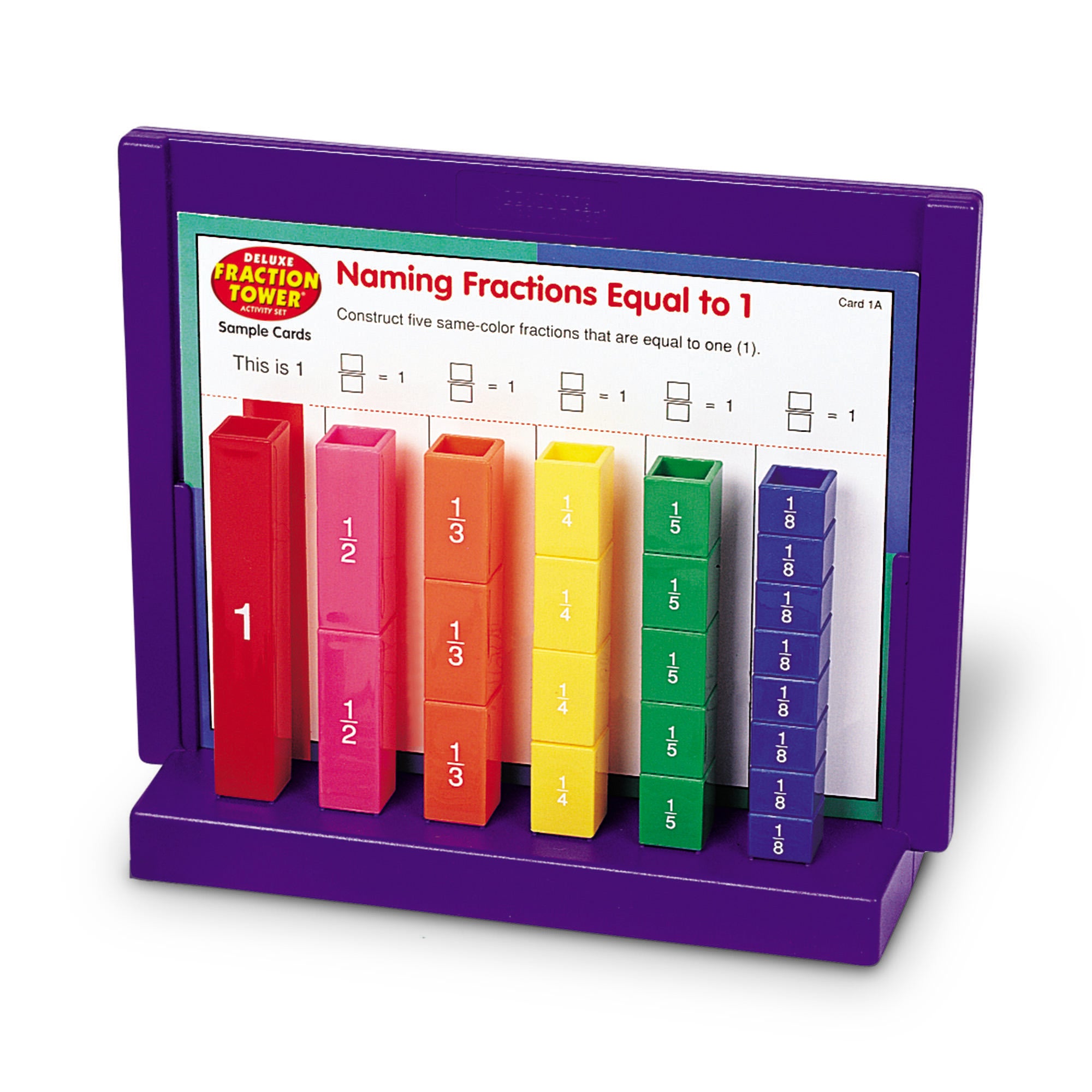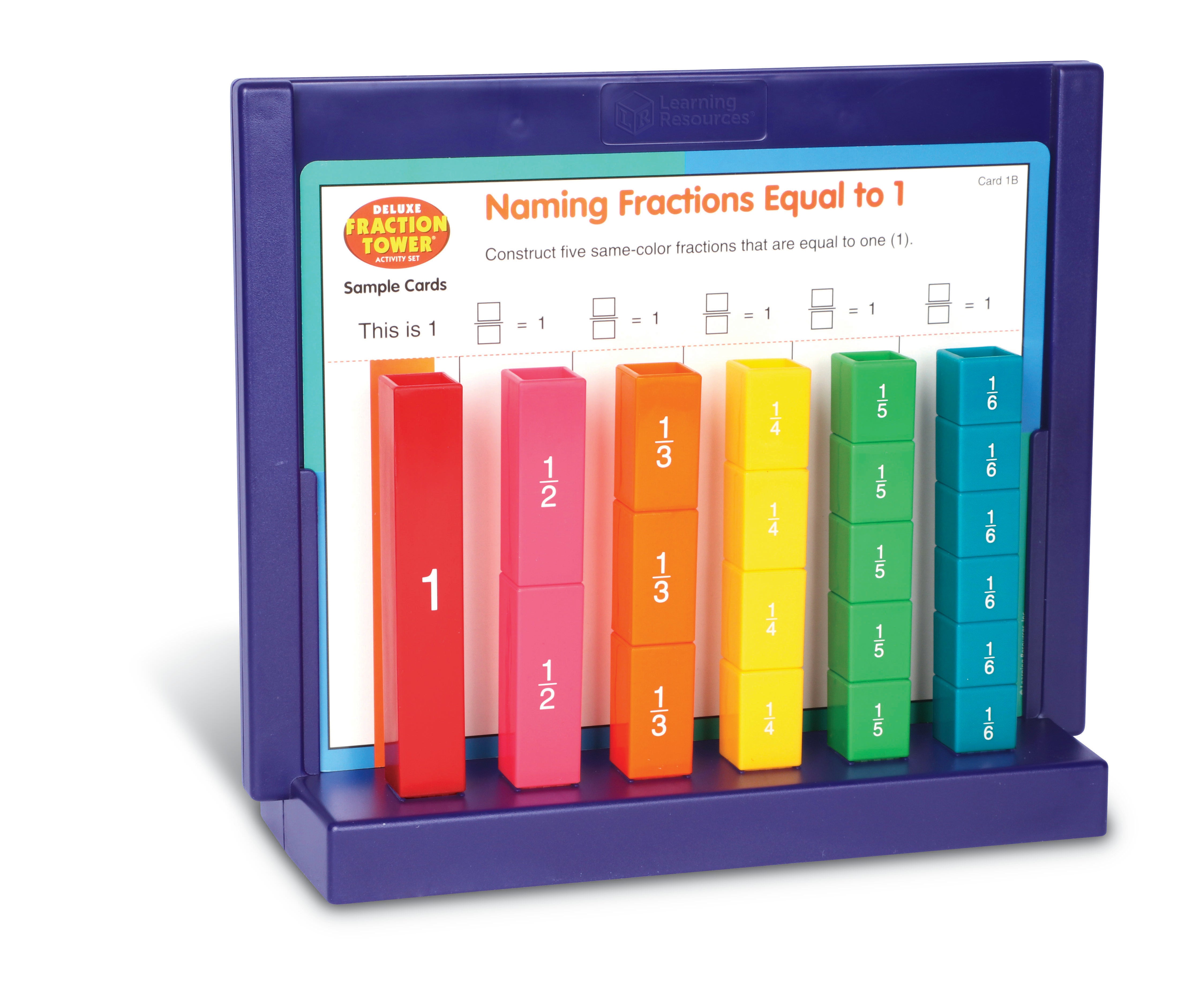 Learning Resources Fraction Tower Activity will have students snap cubes together to visualize and understand abstract fraction concepts. Cubes can be used on their own or with the included base. Set includes 51 cubes, 12 double-sided activity cards, a stand, and activity guide. Ages 6 and up.