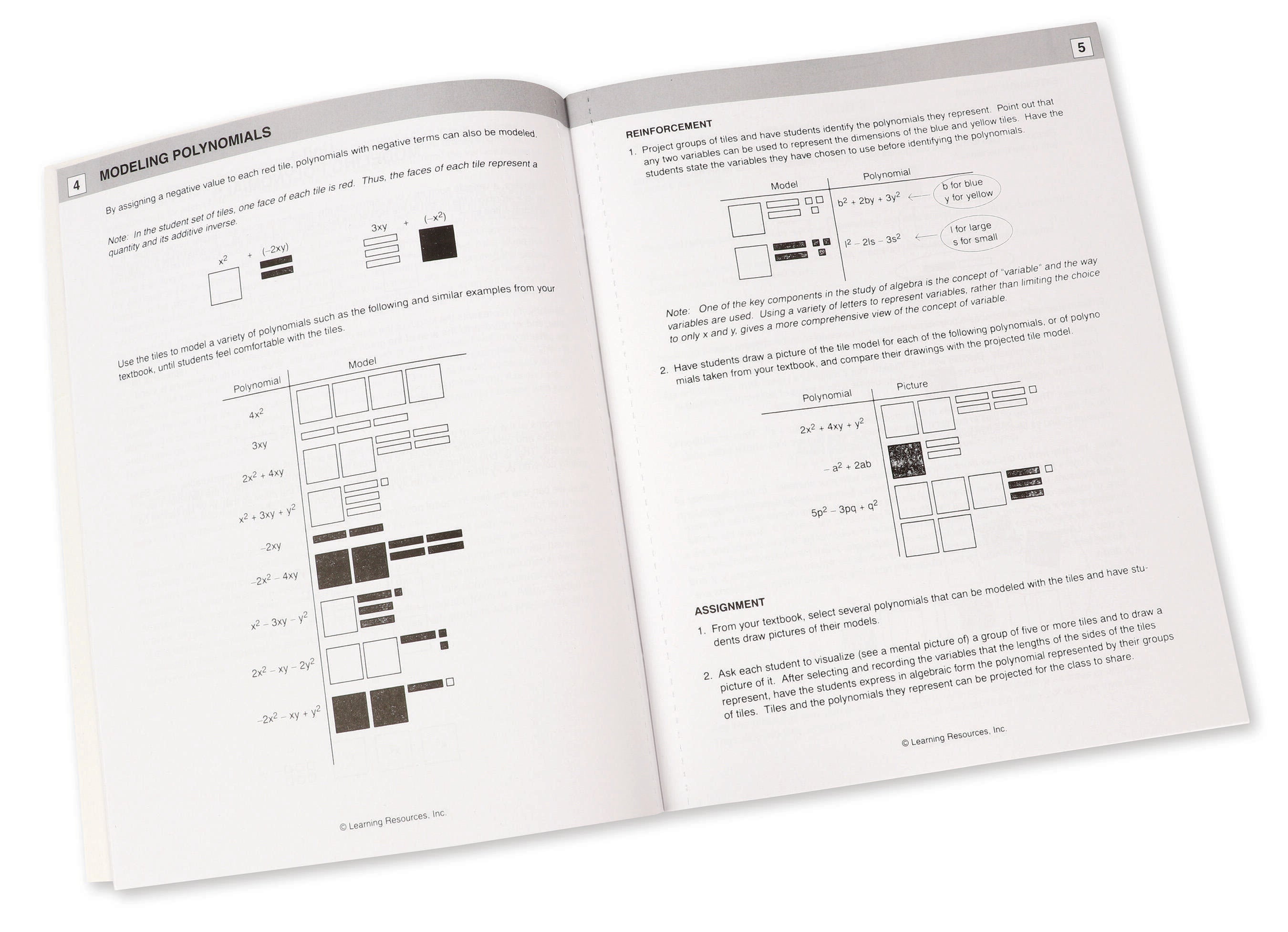 This Learning Resources Algebra Tiles™ set is an interactive and fun way for students to learn foundational algebraic concepts. These sets deliver a versatile learning tool that visualizes abstract math concepts in an intuitive and interactive manner. Each individual set includes 32, color-code, double-sided tiles. The classroom pack includes 30 student sets, an overhead set for classroom demonstrations, and a 40-page activity book. Recommended for grades 6 and up.Features