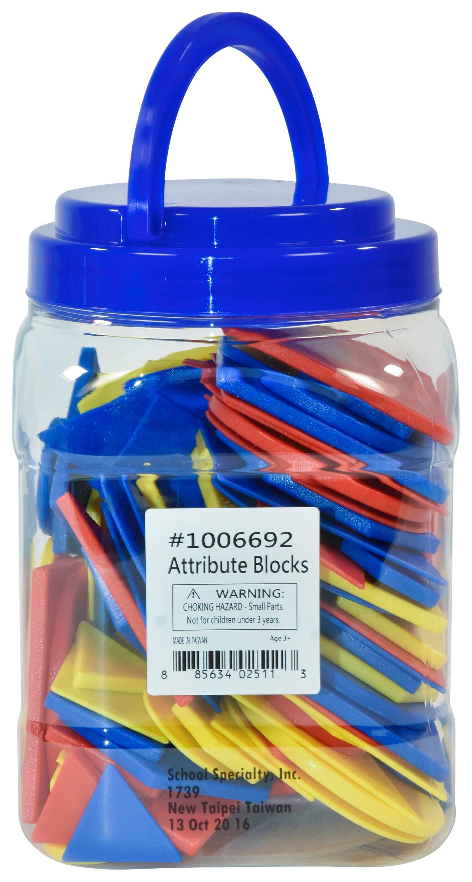 These 120-Piece Attribute Blocks a will make a great addition to your early education math lessons. There are 5 shapes, 2 sizes(large square features 2-61/64 ich sides), 3 colors, and 2 thicknesses.Features