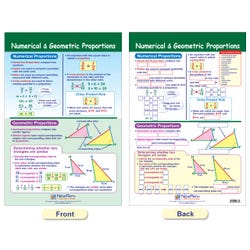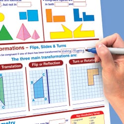 Graphically stimulating, well-organized and highly educational, the Geometry Bulletin Board Chart Set provides an excellent reference resource for your classroom bulletin board or wall, or as a hands-on activity for instruction, review and reinforcement for students in your Math or STEM programs. The Chart Set includes a collection of 6 individual 12” x 18” laminated charts, each covering a separate, curriculum topic. Uniquely designed, Side 1 features a graphic overview of the topic while Side 2 provides “write-on/wipe-off” activity exercises for review and reinforcement. Graphic images and hands-on activities combine to provide comprehensive coverage of essential student information. Perfect for classroom, library or study room reference or for use in learning centers/small group activities; independent study and remediation; or as a teacher resource for introduction and review of key concepts. Topics covered: Geometry & Measurement; Lines, Angles & Circles; Congruence, Transformation & Symmetry; Plane Geometry; Arithmetic & Geometric Sequences; and Numerical & Geometric Proportions.