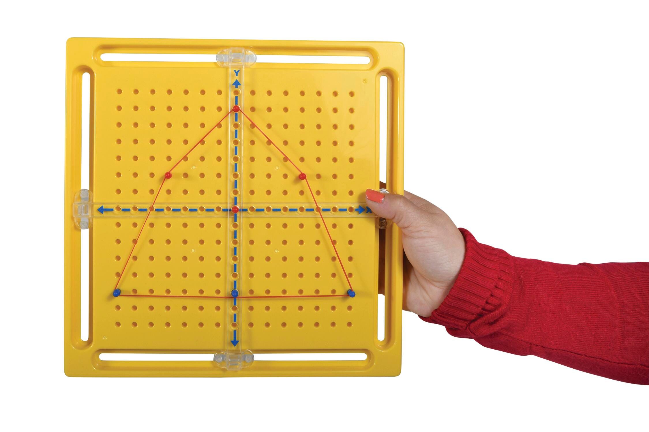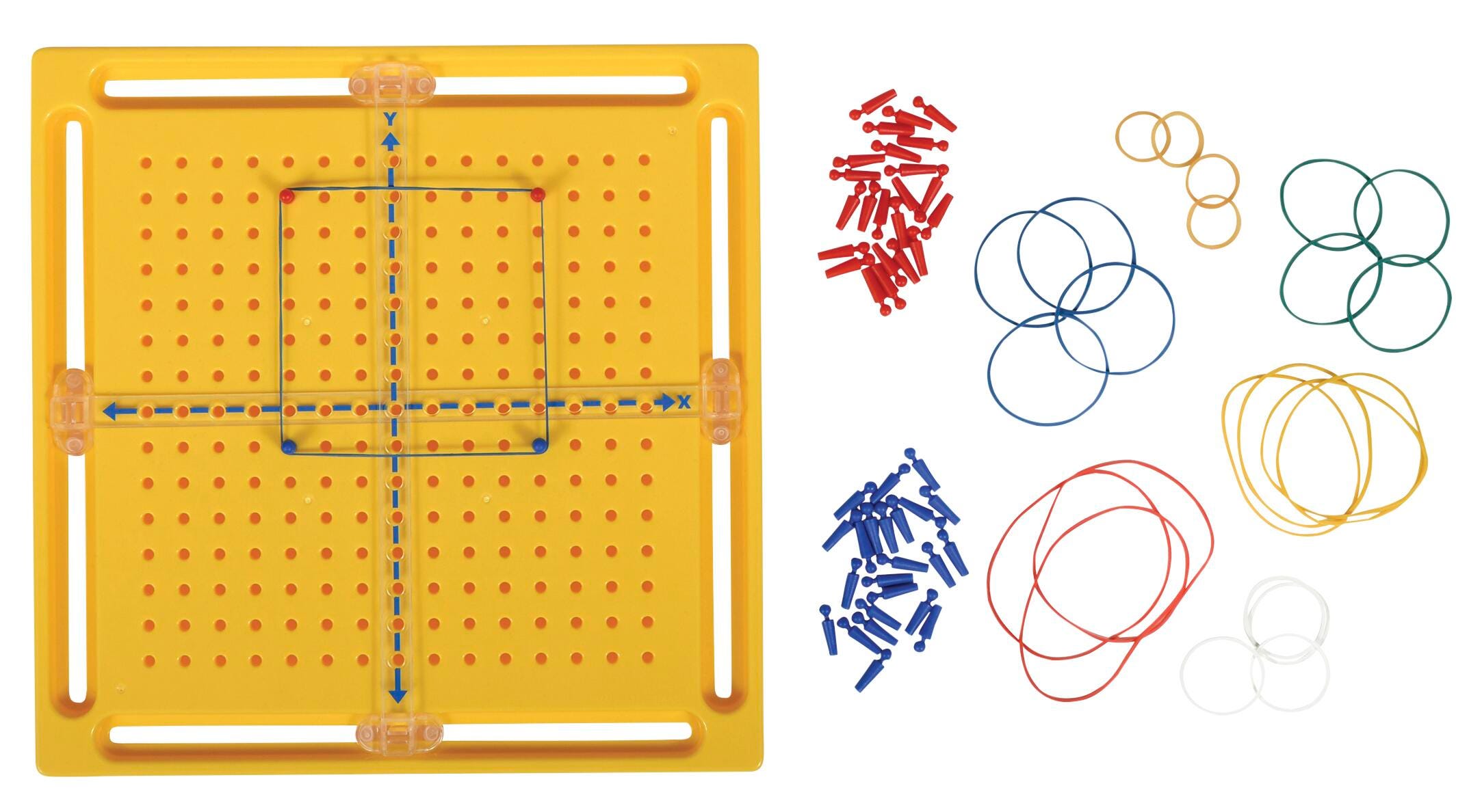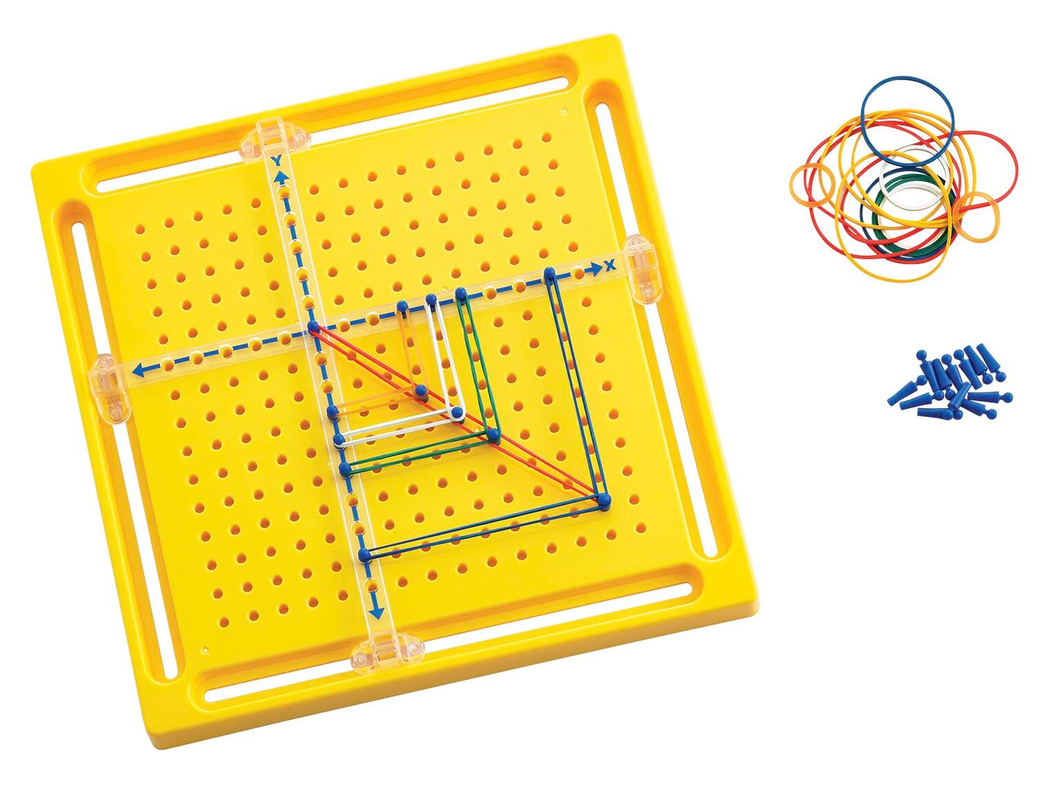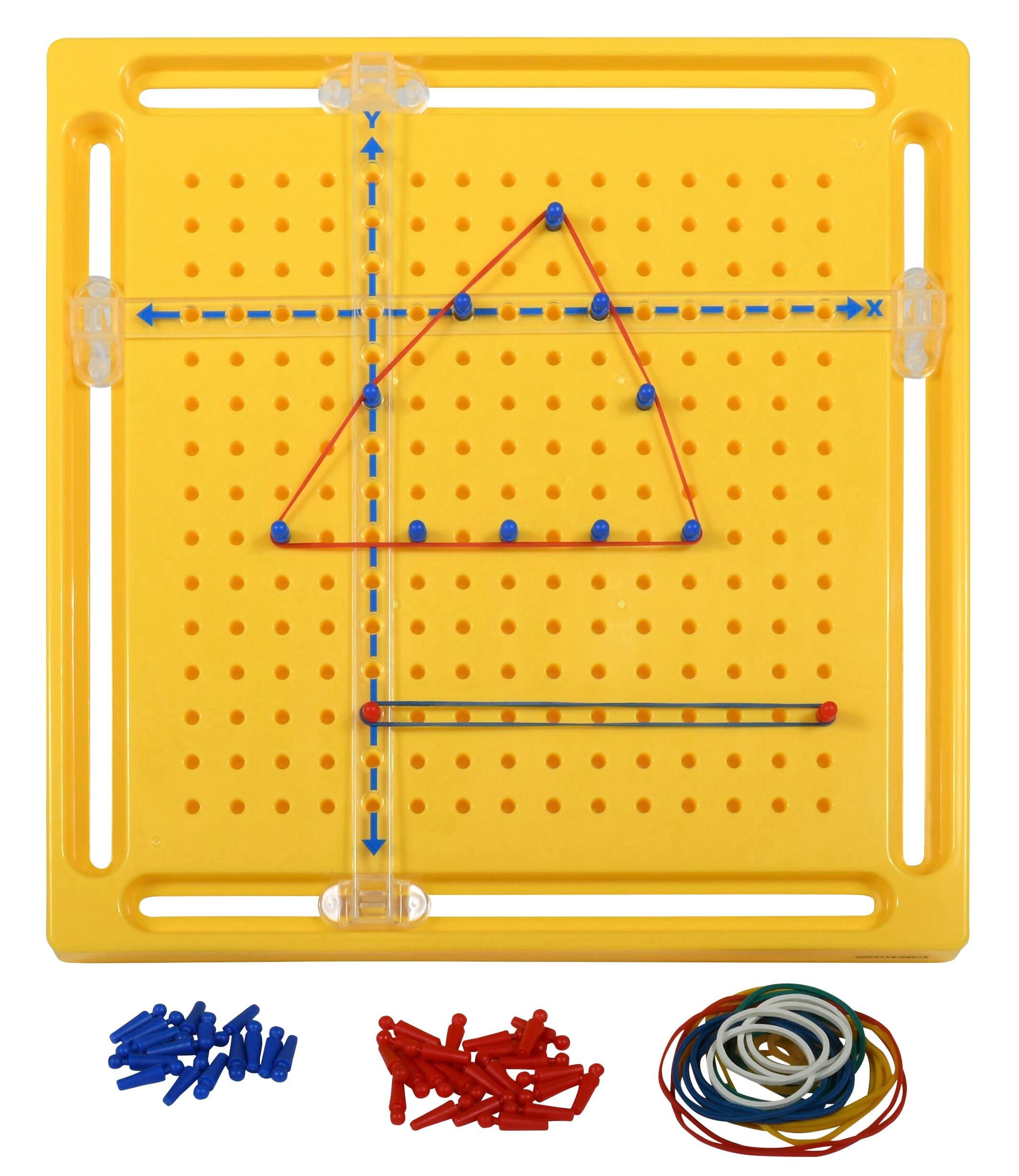 Learning Advantage Geoboard Movable X and Y Axis Pegboard Set comprises of 1 pegboard with sliding X and Y axis, 25 blue pegs, 25 red pegs, an X and Y sliding axis and rubber bands. Pegs in 2 colors make coordinate graphing fun as well as easy to understand. Pegs can be used to plot graph points in one or all 4 quadrants, demonstrate geometric translations, rotations, reflections, data in bar or line graphs, etc.