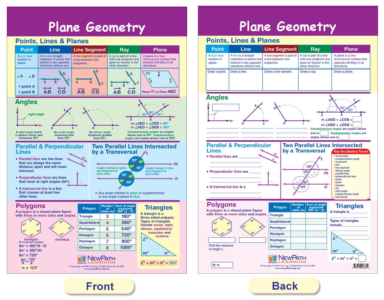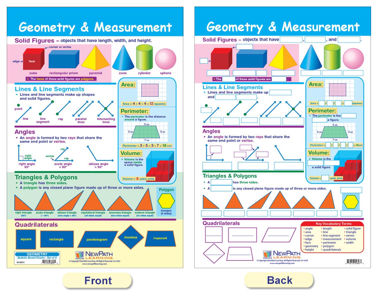 The Geometry Bulletin Board Chart Set includes the following 6 double-sided, laminated charts: