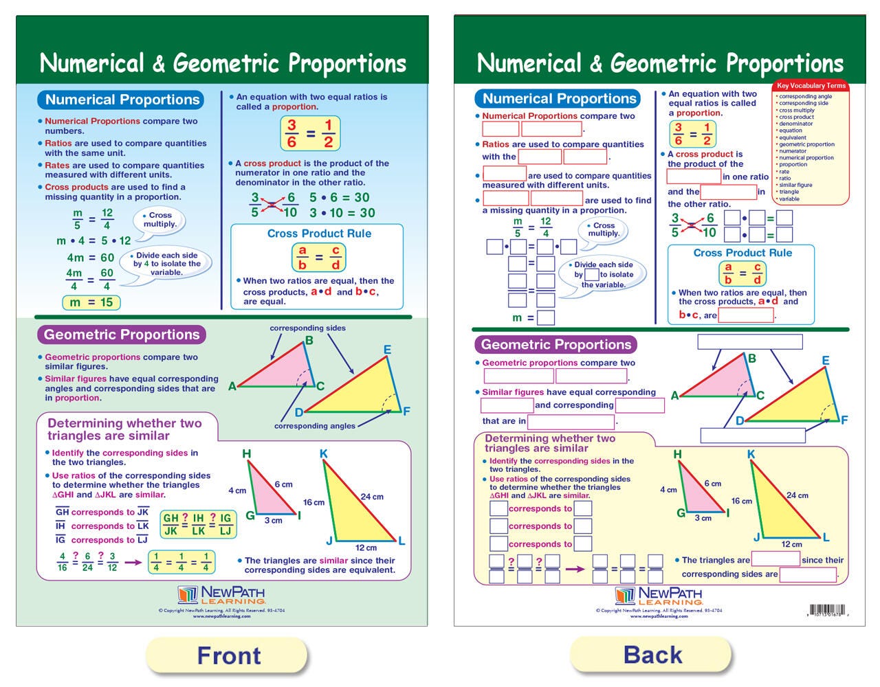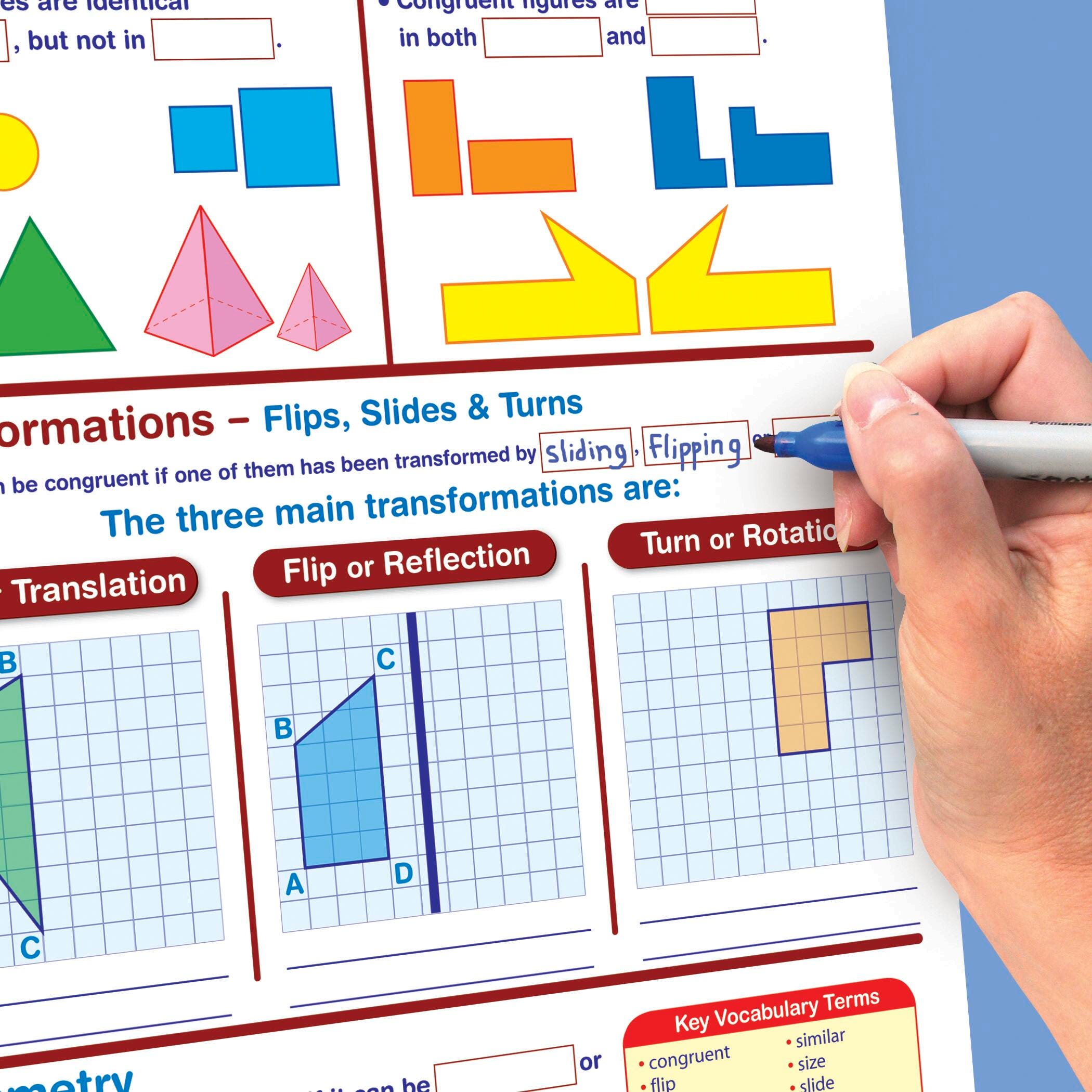 Graphically stimulating, well-organized and highly educational, the Geometry Bulletin Board Chart Set provides an excellent reference resource for your classroom bulletin board or wall, or as a hands-on activity for instruction, review and reinforcement for students in your Math or STEM programs. The Chart Set includes a collection of 6 individual 12” x 18” laminated charts, each covering a separate, curriculum topic. Uniquely designed, Side 1 features a graphic overview of the topic while Side 2 provides “write-on/wipe-off” activity exercises for review and reinforcement. Graphic images and hands-on activities combine to provide comprehensive coverage of essential student information. Perfect for classroom, library or study room reference or for use in learning centers/small group activities; independent study and remediation; or as a teacher resource for introduction and review of key concepts. Topics covered: Geometry & Measurement; Lines, Angles & Circles; Congruence, Transformation & Symmetry; Plane Geometry; Arithmetic & Geometric Sequences; and Numerical & Geometric Proportions.Features