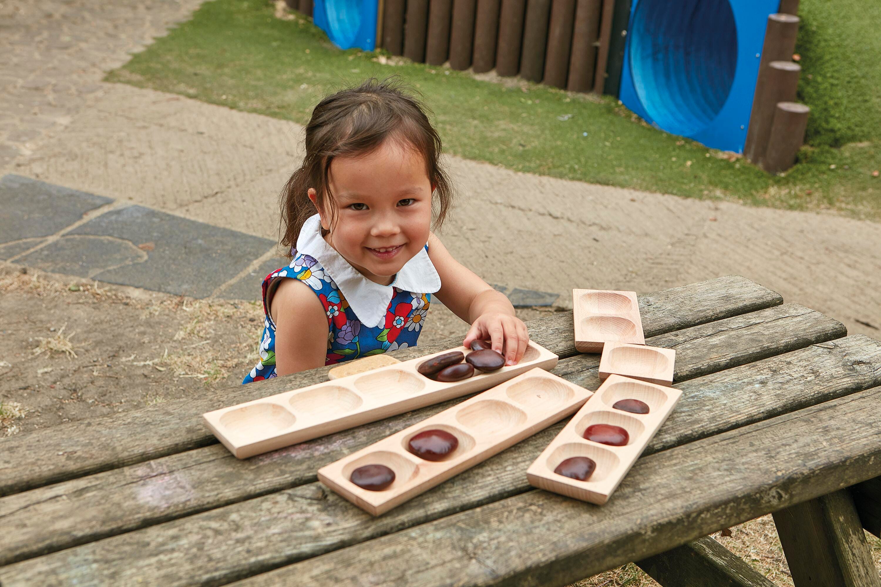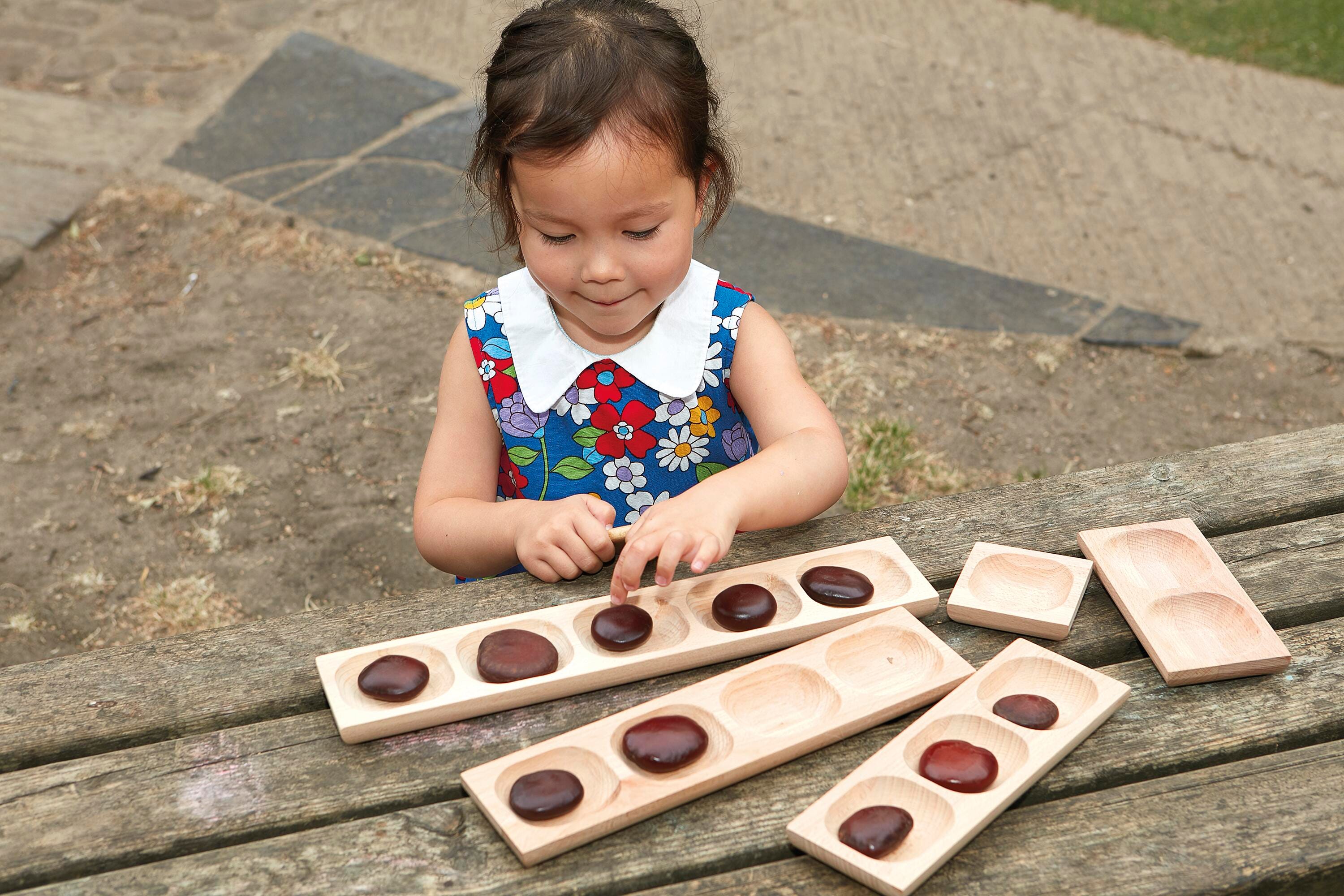 Learn bases of 1, 2, 3, 4, and 5 with these handy wooden compartment trays! Great for indoor or outdoor learning alike, each tray can be enhanced with the addition of counters or objects like stones, acorns, and beyond.