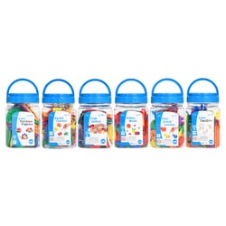 Great tool for in-school or in-home learning! Each jar contains an assortment of hands of manipulatives and comes in an easy carrying and plastic storage jar. The set includes Rainbow Pebbles, Junior Geostix, Pattern Blocks, Large Buttons, Aquatic Counters and Farm Animal Counters. Appropriate for ages 3 years old and up.Features