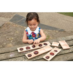 Learn bases of 1, 2, 3, 4, and 5 with these handy wooden compartment trays! Great for indoor or outdoor learning alike, each tray can be enhanced with the addition of counters or objects like stones, acorns, and beyond.