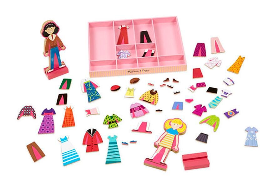- Features 2 wooden magnetic dolls to dress in coordinating mix-and-match outfits
