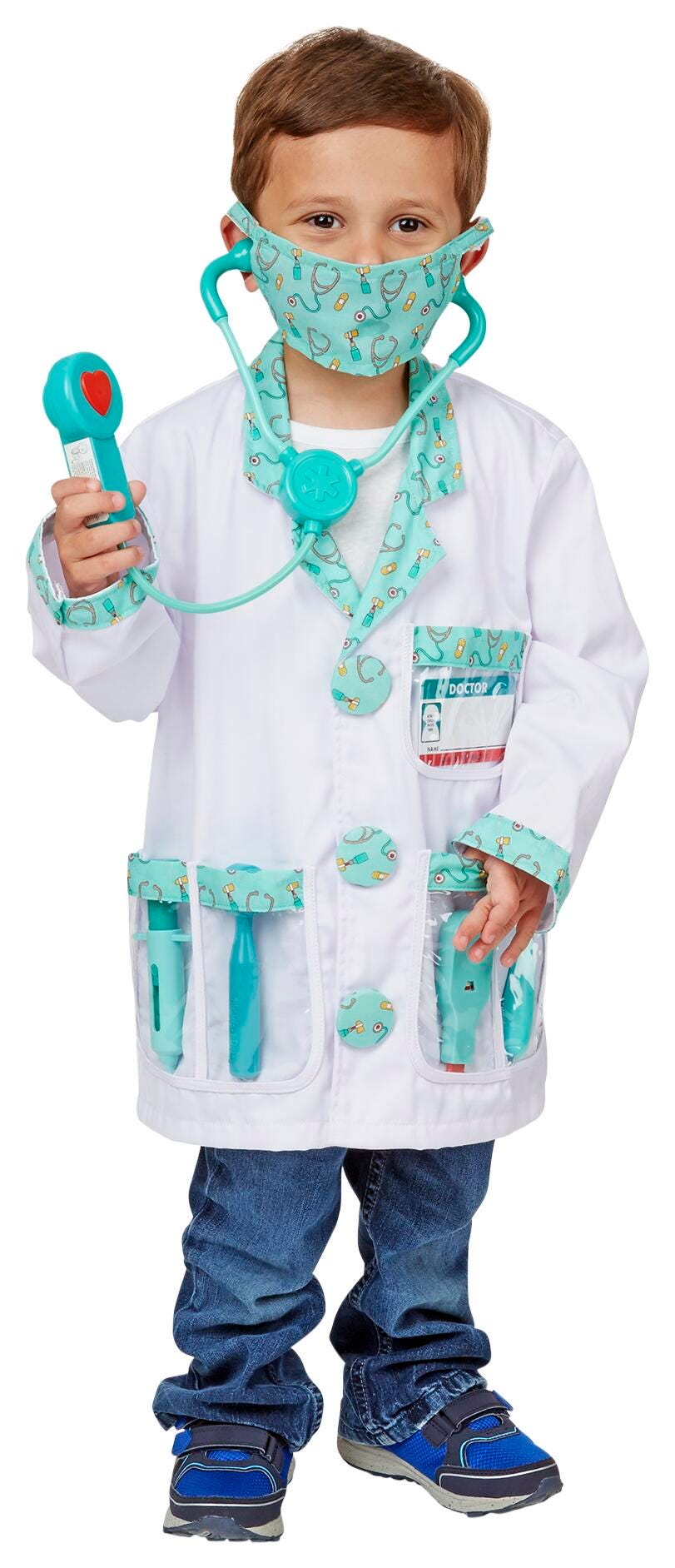 The doctor will see you now! With this set, children will be fully equipped with a jacket and mask, a stethoscope with sound effects, a reflex hammer, an ear scope, a syringe, and a name tag for personalizing. This clothing set is created for ages 3 to 6. One size fits most. The stethoscope requires AAA batteries, which are not included.