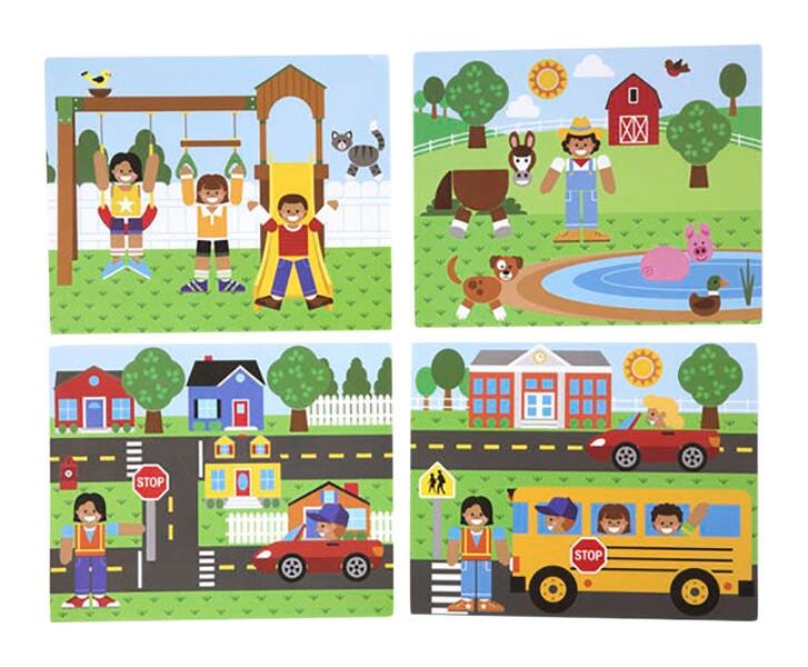 Scenes include a day on the farm, backyard playtime, heading off to school, and a busy day in town