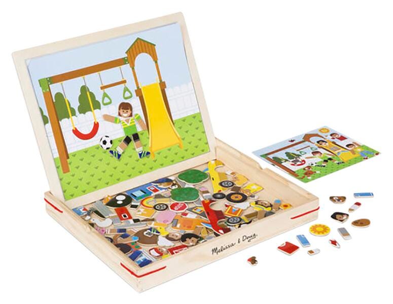 Young ones can combine wooden magnets to recreate fun scenes on a game board