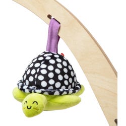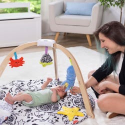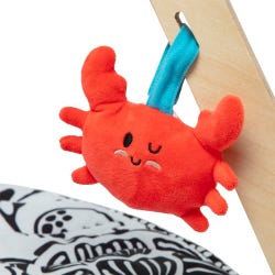 Perfect for infants and toddlers who need an engaging mat in the playroom or on the go - equipped with built-in child-safe mirror, a multi-textured sea star, a squeaking crab, and much more to inspire tactile play and fine motor development. This ocean-inspired Easy-Fold Play Gym is equipped with Quick-Close storage for simple transportation and is thoughtfully designed to guide babies from birth to 9 months through multiple developmental stages. Sturdy, wide wooden arches are pre-assembled for easy set-up and offer caregivers easy access and monitoring. Comfortable, reversible play mat is equipped with sensory ribbons and a crinkling peek-a-boo clam shell. One side of the mat features high-contrast black-and-white graphics for early visual stimulation, and the other includes a full-color ocean scene to keep older babies engaged as vision develops. Measures 29-1/2 L x 9-1/2 D x 6-2/5 H inches.Features