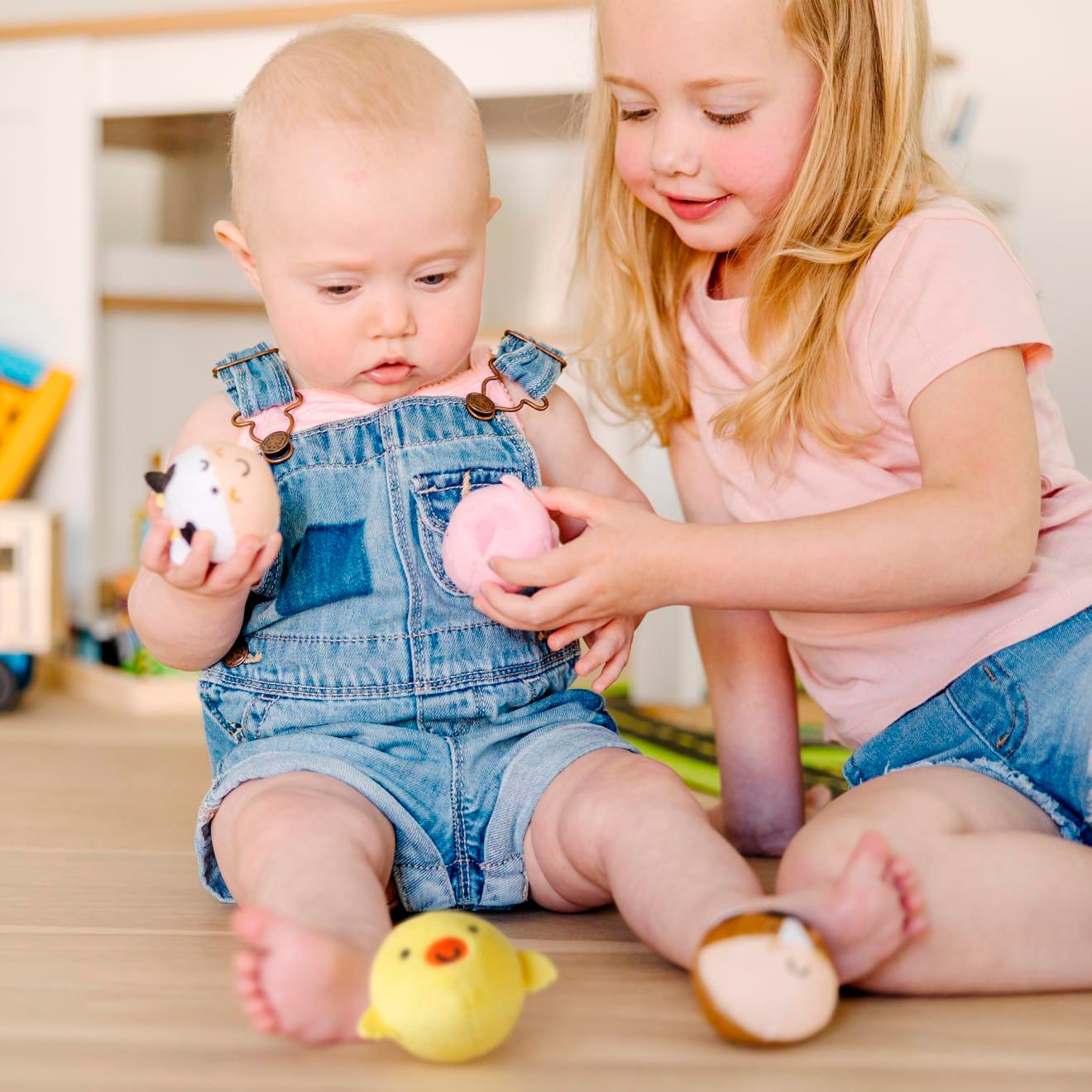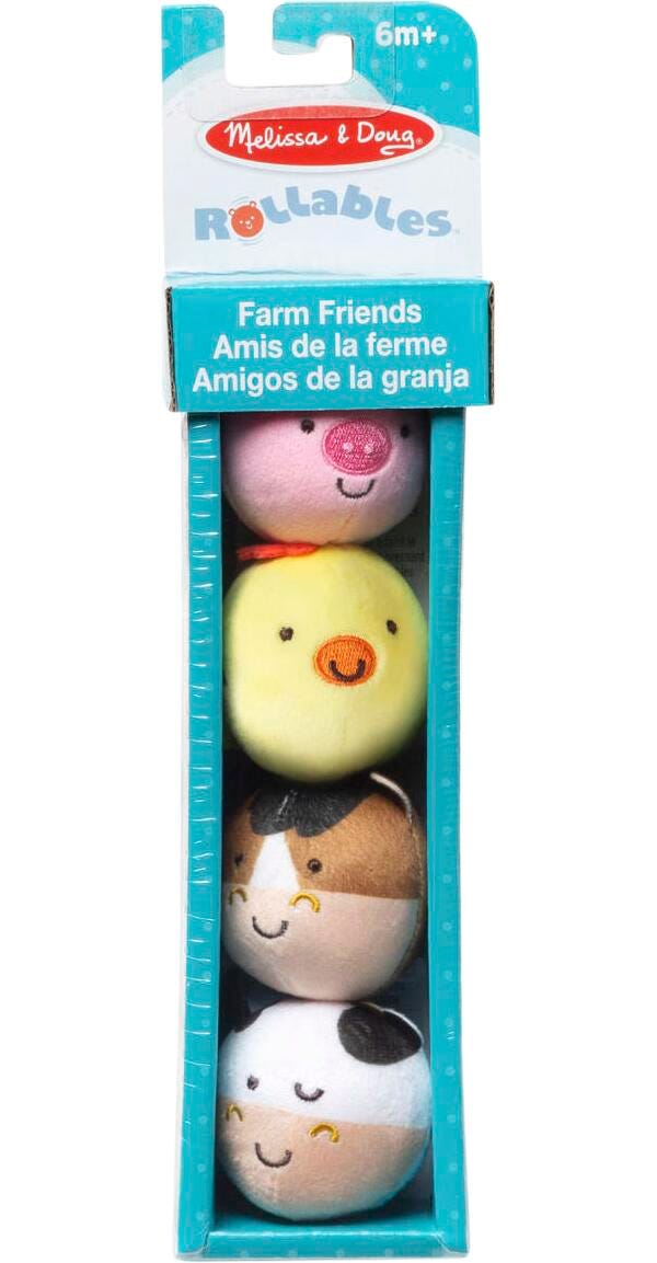 Inspire imaginative animal adventures through kinetic play with safari and farm animal Rollables that store conveniently in the package: the perky pig, cheery chicken, friendly horse, cute cow with chime, mischievous monkey, striped zebra, gentle elephant, and friendly lion with a chime. Compatible with other Rollables play sets. Rollables are an engaging way to encourage the development of important sensory and fine motor skills. Melissa & Doug infant and toddler playsets inspire “a-ha!” moments of discovery. Adorable, diverse characters and a variety of fun shapes and textures encourage exploratory, skill-building play.