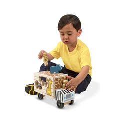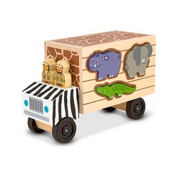 With this rugged Melissa & Doug safari truck, two cheerful people are ready to zoom across the savanna to help their animal friends. The animals fit into the sides of the wooden truck through die-cut slots. Lift and remove the cargo door to unload the colorful animals, then count and stack the solid-wood pieces before loading the truck and securing the door in its track. One male and one female ranger fit in the cab of the truck, or they can come out to tend to the animals on the preserve!Features