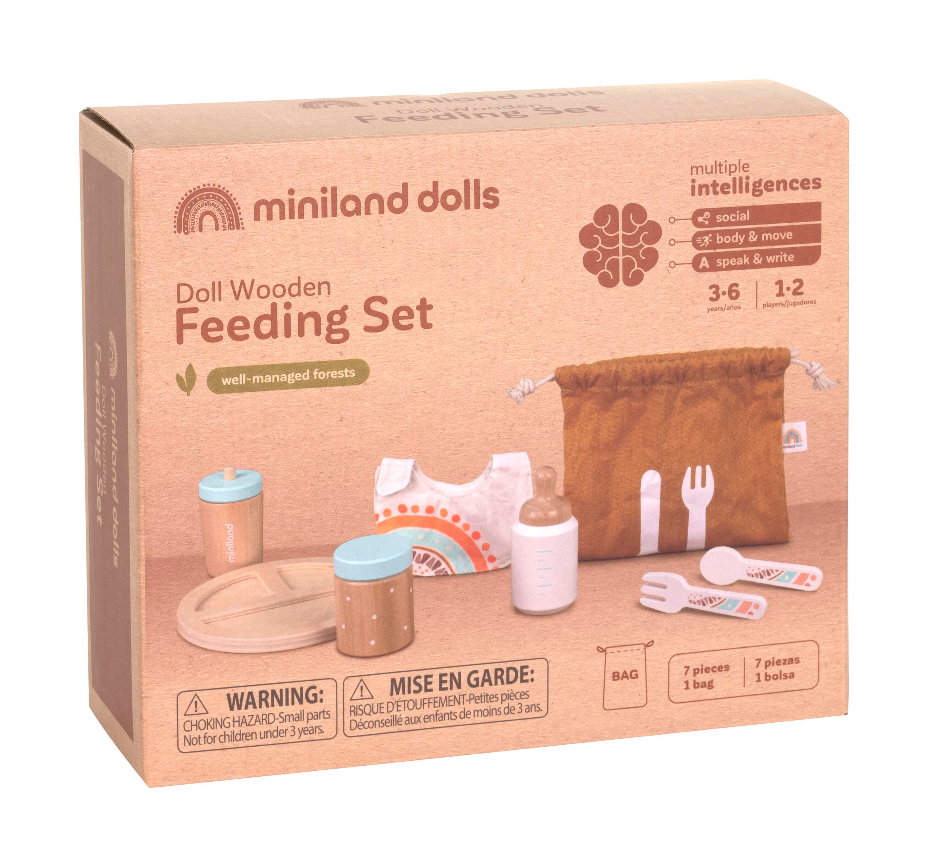 The Miniland Wooden Doll feeding set is perfect for dramatic play areas at home, school, or childcare centers to encourage role-play and social interaction!