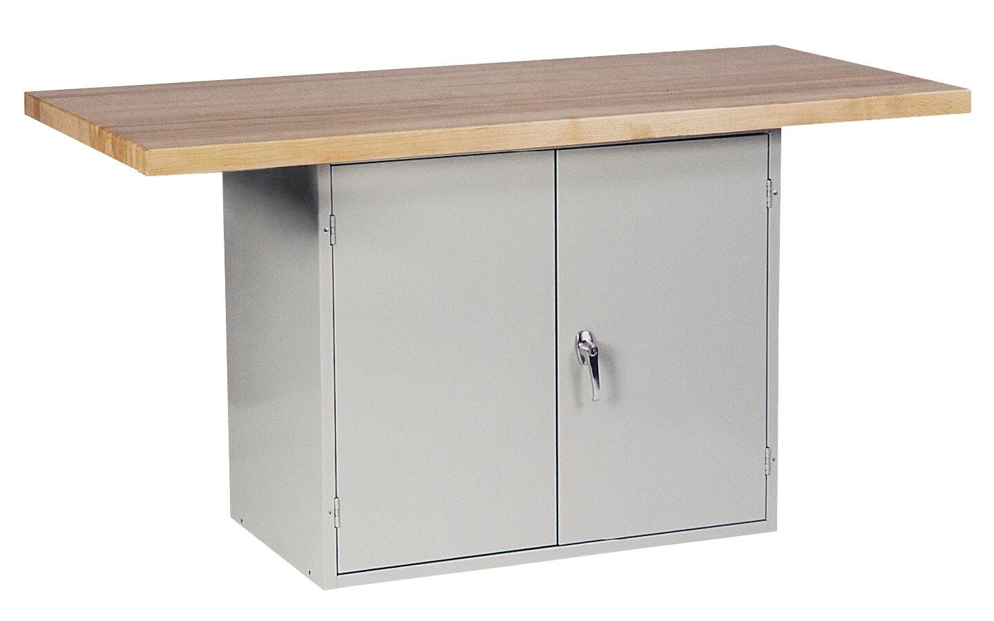 Montisa two station workbench has a sturdy steel base with one shelf, spring-loaded locking double doors, and a laminated maple top. Also includes one vise. Each door measures 36 x 21 x 31 inches.Features