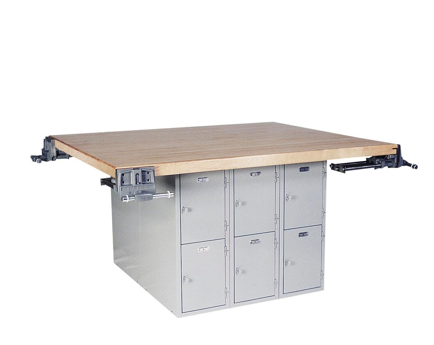 Montisa four station workbenches offer a range of options for educational environments. These hard-working benches are built to last, with solid base units supporting a hard maple surface. Base units are 36 x 42 x 31 inches. Comes with 4 vises.Features