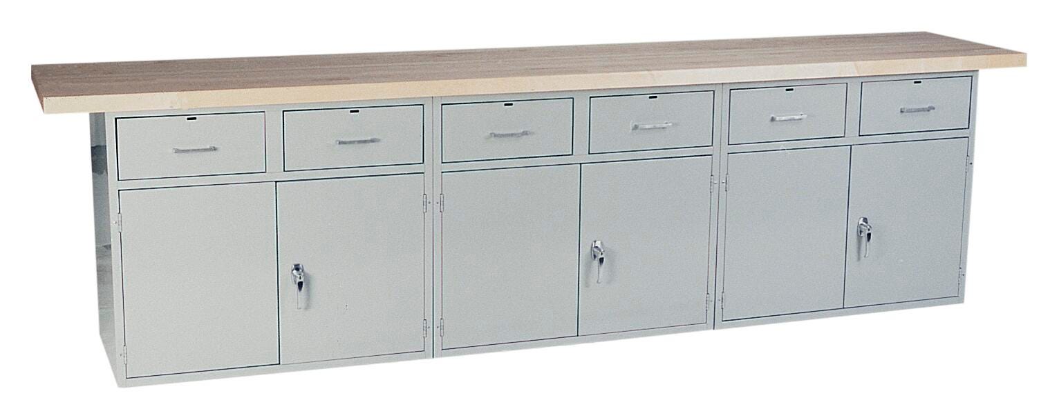 Montisa high quality wall/island bench is made of heavy-gauge steel and hard maple to offer long lasting durability. Bench is equipped with an adjustable shelf, spring-hinged double doors, 2 drawers and a split. The maple top has a polyurethane finish that offers strong resistance to wrapping. Doors incorporates chrome finished handle with master-keyed cylinder lock and drawers are complete with nylon rollers for additional convenience.