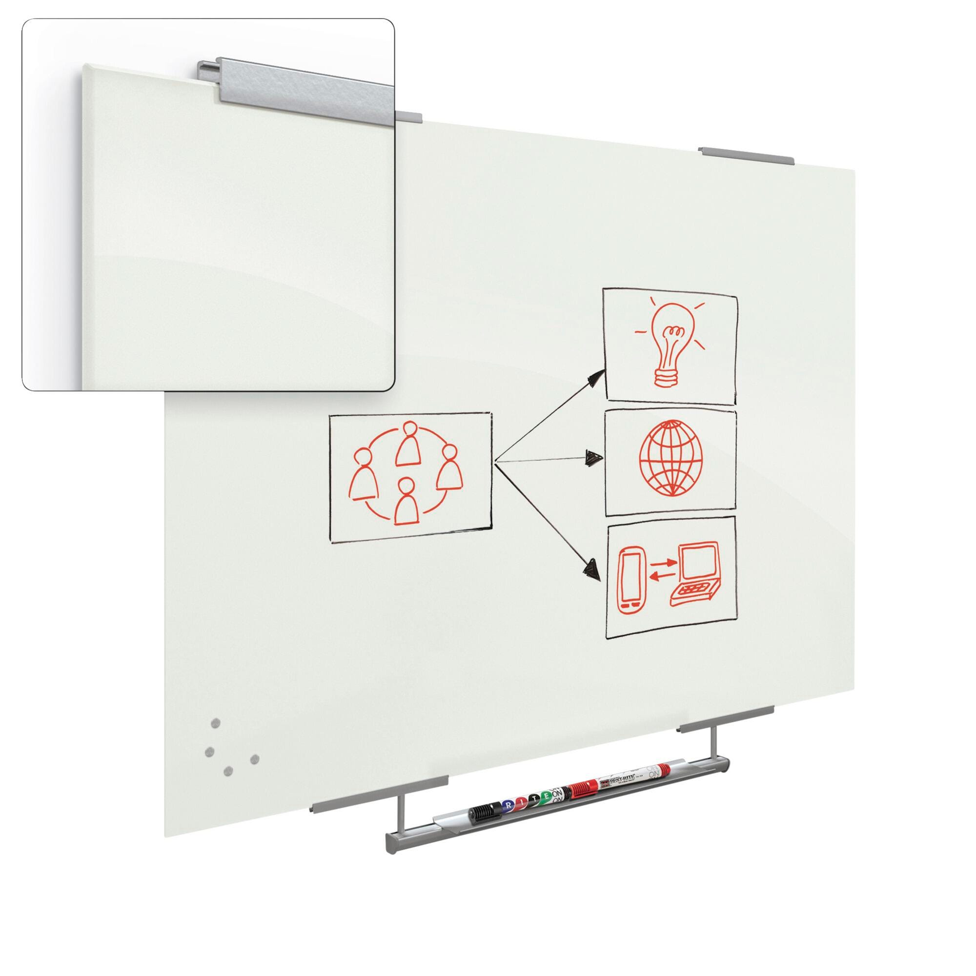 Modernize your space with a functional and contemporary image. Visionary magnetic glass boards provide the best of a quality whiteboard with smart style. The exo tray stystem provides clean and functional anodized aluminum accessory storage. Tempered safety glass ideal for use in any environment. Available in gloss white. Compatible with any dry/wet-erase marker, grease pen, etc. Easily cleans without ghosting or staining. Includes set of magnets, markers, and eraser. Fifty year limited warranty. Has achieved greenguard gold certification. The MooreCo glass boards only accept rare earth magnets.