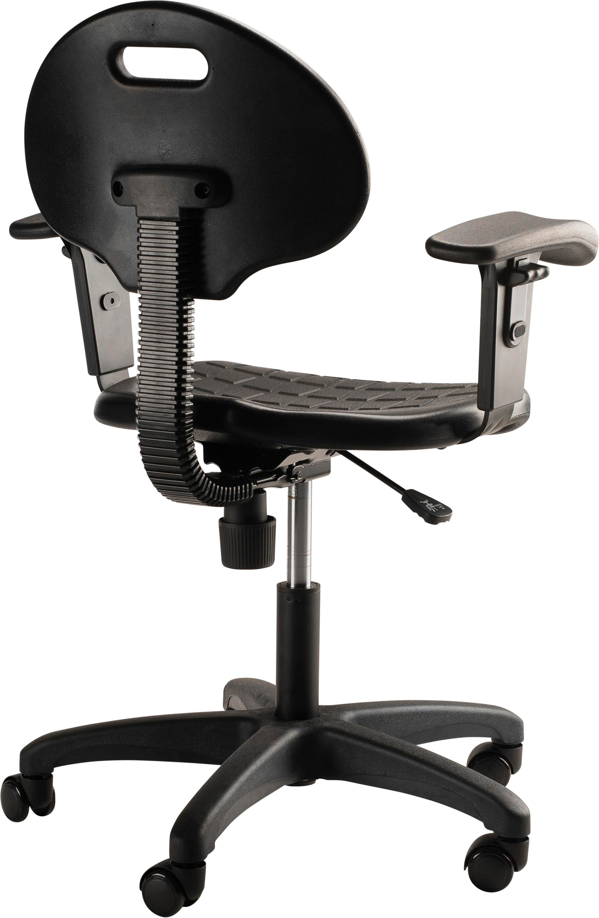 The National Public Seating Kangaroo Stool provides unique strength and versatility for your industrial seating demands, yet is designed with beauty and grace in mind. This model's addition of arms enhances the stool base, offering added support and comfort. This model has a heavy duty 1.25 inch thick Polyurethane seat and a waterfall edge for plush comfort and functionality. The seat height and arm height are both adjustable. The ribbed ventilation design allows for air circulation while seated, and Polyurethane material is resistant to chemicals and punctures and cleans easily.Features