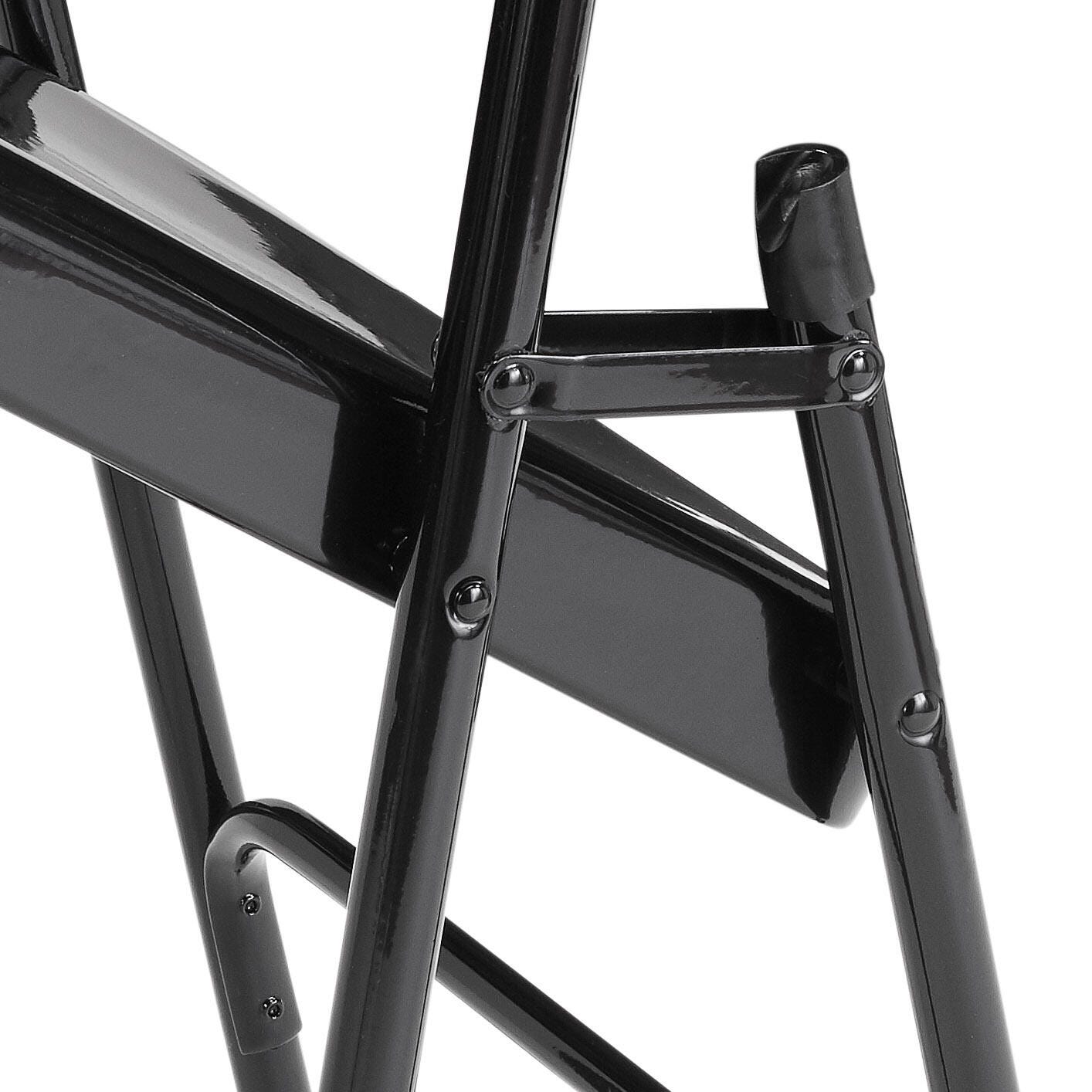 Elevate your temporary seating solution with this set of comfortable, durable, black fold-up chairs. Rated up to 500-pound weight capacity, these chairs have double hinge on each side to prevent legs from buckling and double riveted stronger ''U'' brace. Features a unique full size back with double contour for maximum comfort. Available in black. Chair measures 18-3/8 W x 19-1/2 D x 29-5/8 H inches, with a seat height of 17-1/4 H inches.Features