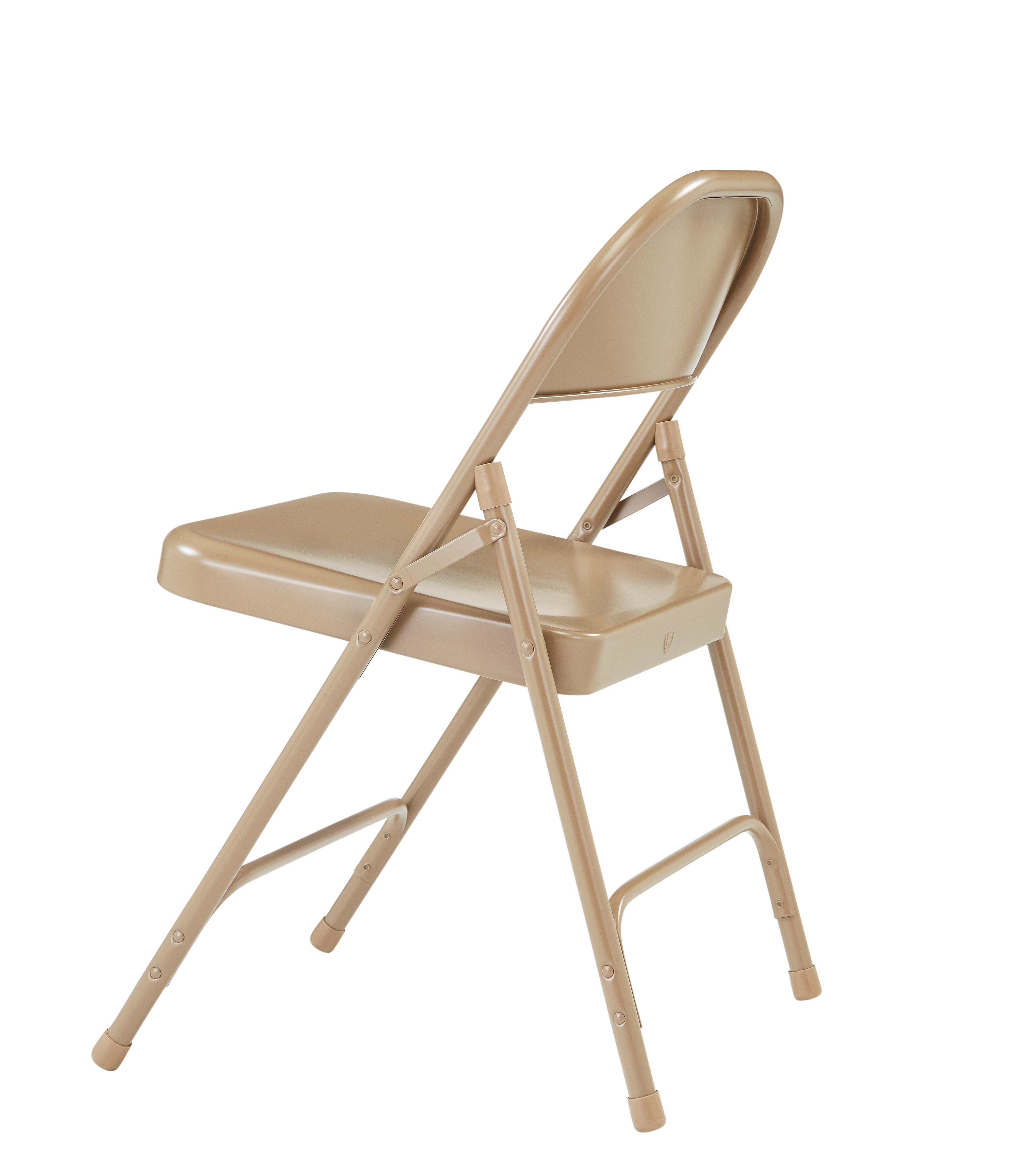 The 50 Series Standard All-Steel Folding Chair features color coordinated V-Tip plugs for added stability and 19-gauge 7/8-inch round tubular frame with a 2-1/2-inch frame strengthener on each side of the seat. There are also two 19-gauge 5/8-inch U-shaped double riveted cross braces for durability. Chair back features a single contour with curled safety edges and is electro-magnetically welded to the frame. Measures 18-1/4 W x 18-1/2 D x 29-1/4-H inches and has a seat height of 16-3/4 inches.