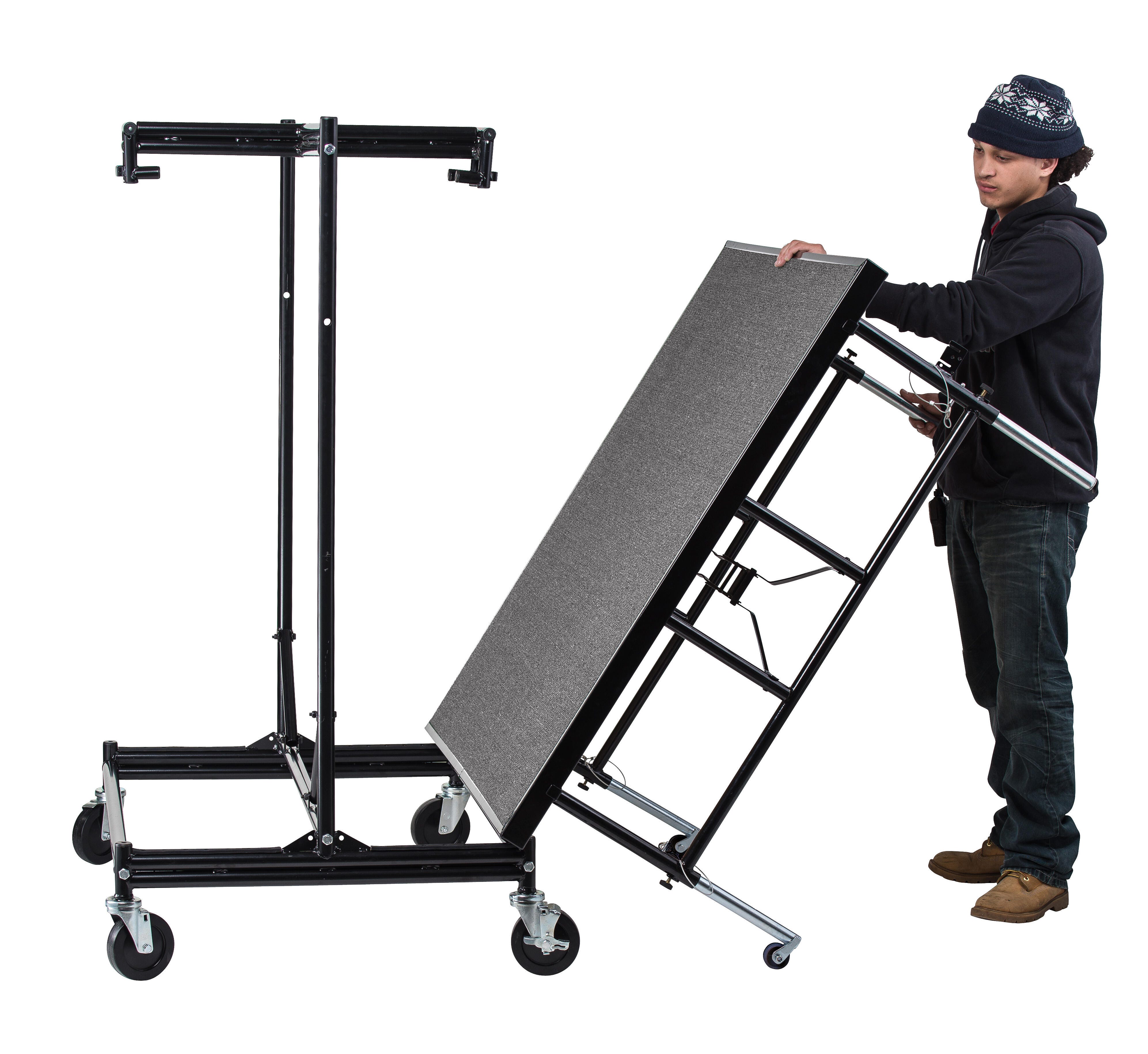 This lighter-weight portable platform by NPS is the perfect solution for when one person will be doing the setup. Roll to the desired location on built-in 2-inch caster wheels, and open, and lock the legs in place. Each stage comes with drop-in couplings that allow units of the same or different heights to be joined together. Legs are adjustable in two heights from 16 or 24 inches. It has a 16-gauge 1-13/16-inch high formed steel channel frame reinforced with a 16-gauge steel angle welded to the inside of the channel. Exceeds 200 pounds per square foot load-bearing capacity, and the platform is constructed with a 3/4-inch solid plywood core.